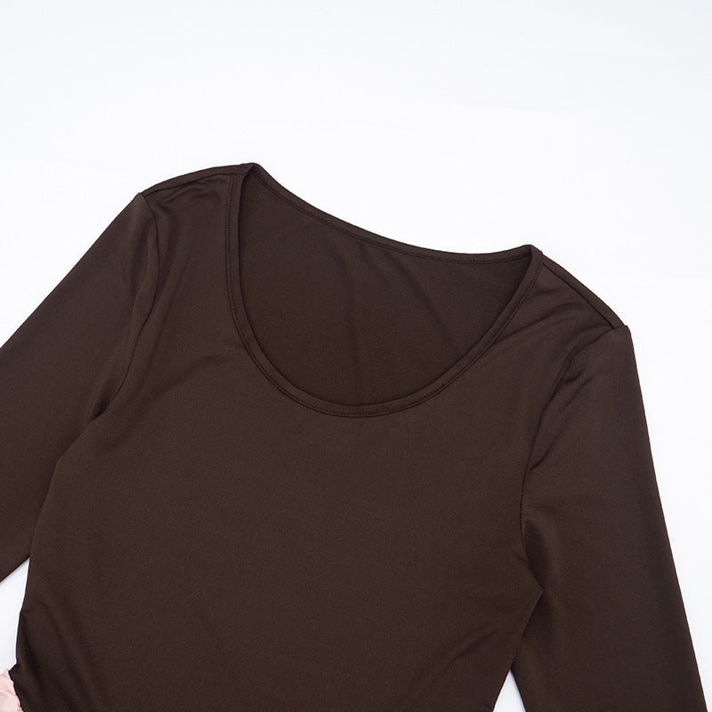 This color-block women's gown pairs rich brown with soft pink for a head-turning look—perfect for weddings, galas, or upscale events. The long-sleeve top fits perfectly to highlight your shape, while the pink skirt features dramatic ruched detailing at the waist.