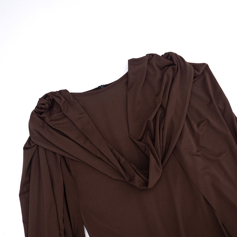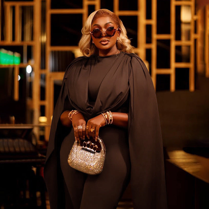 This jumpsuit is ideal for red carpets, evening events, or bold special occasions. The form-fitting bodycon silhouette hugs curves for a polished look, while the cape-style sleeves add movement with every step. It features a high neck and full-length leggings for a streamlined finish.