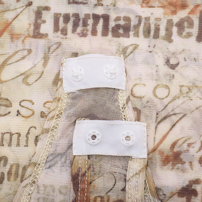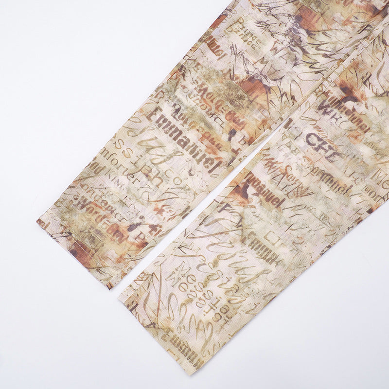 MB10124 Vintage Text Print Sheer Mesh Two Piece Set - Bodysuit & Skinny Pants