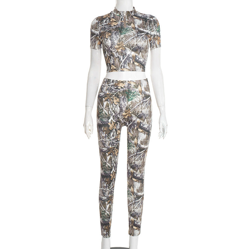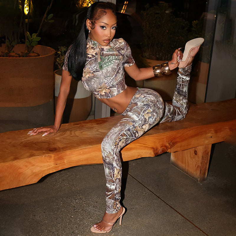 MB10125 Leaf Camo Print Two Piece Set - Crop Top & High Waist Pants