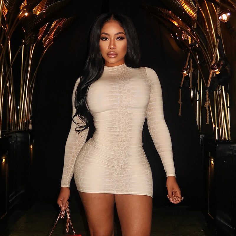 This bodycon mini dress brings subtle boldness with its understated cream snake print:
