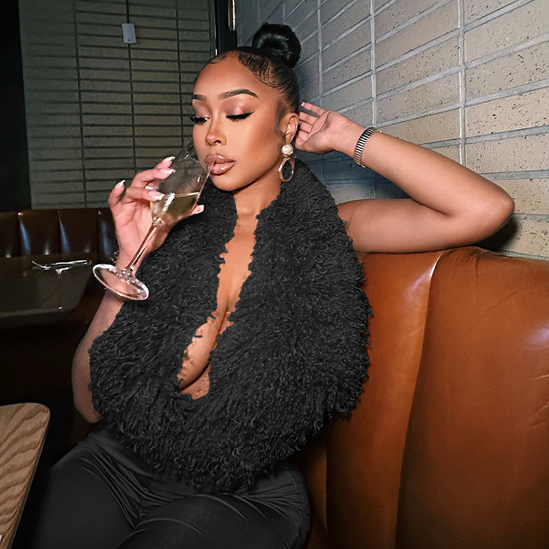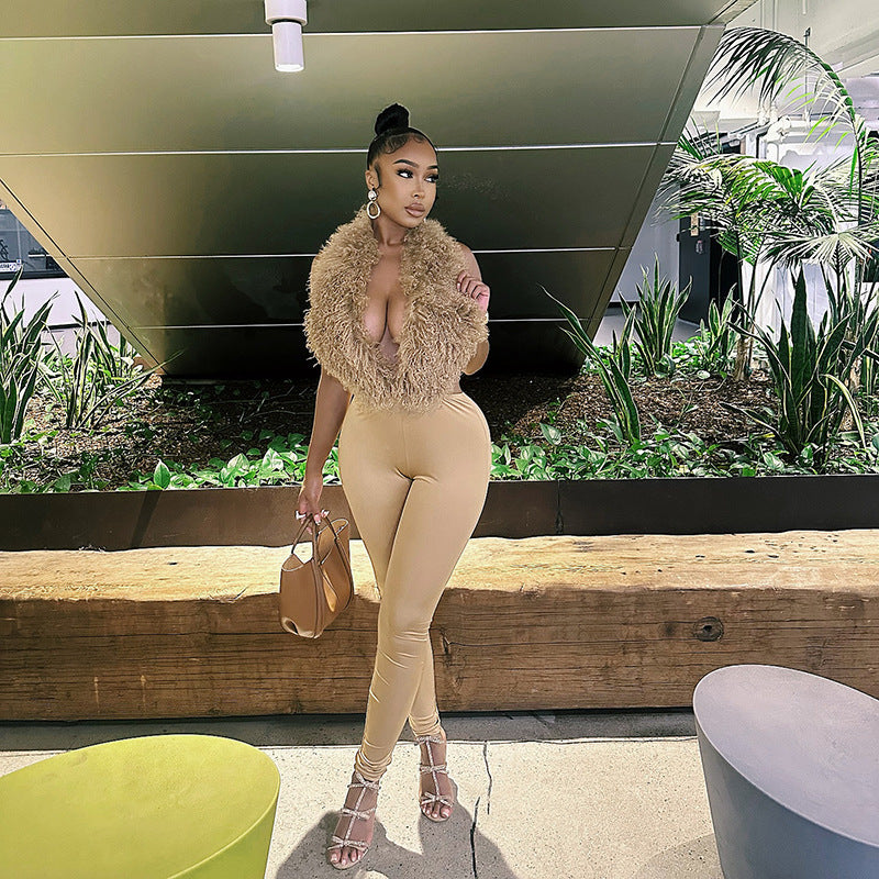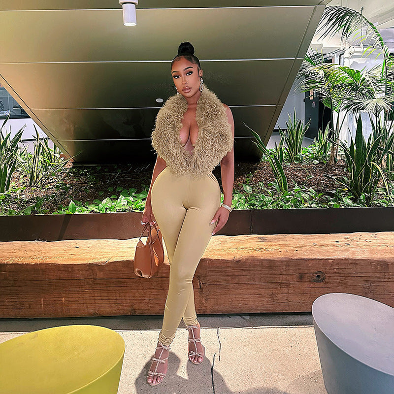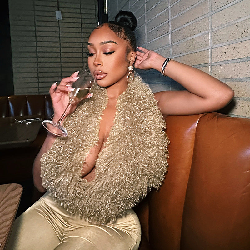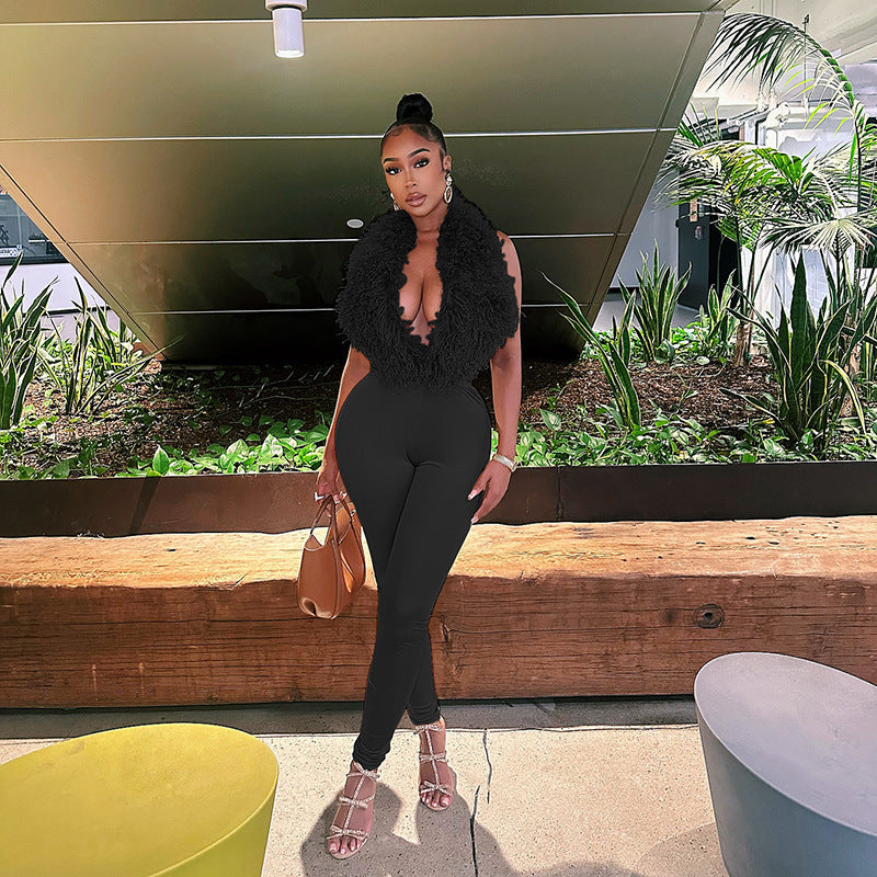 Perfect for club nights, parties, or bold street style. Features a luxurious fuzzy texture, deep V-neck, and high-waisted leggings for a flattering silhouette.