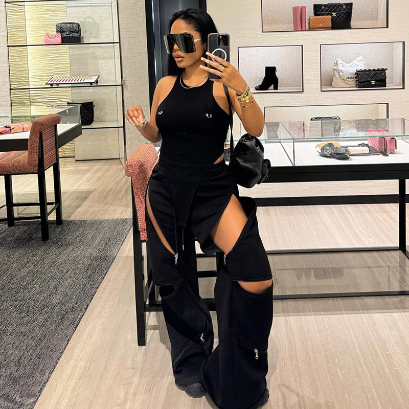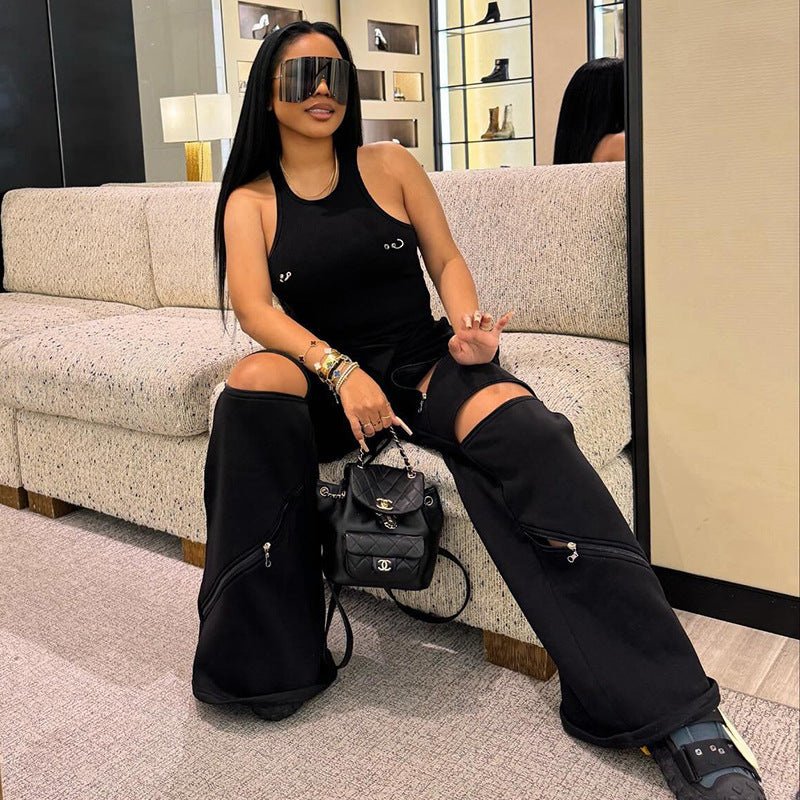 The unique cutout and zip elements create a layered, dynamic look. Whether paired with a sleek tank top or a cropped hoodie, these pants are ideal for anyone wanting to make a statement in street style.