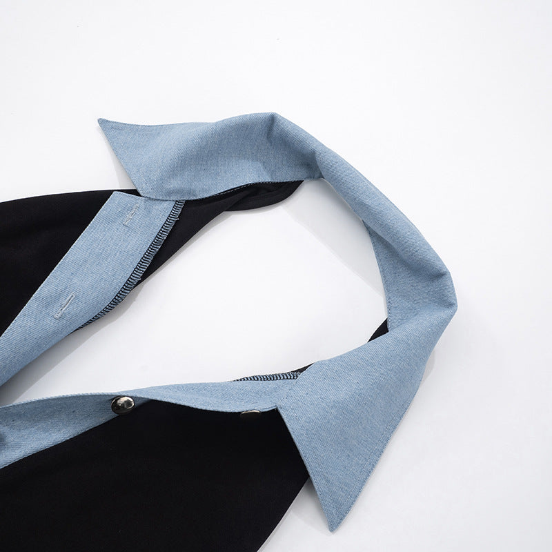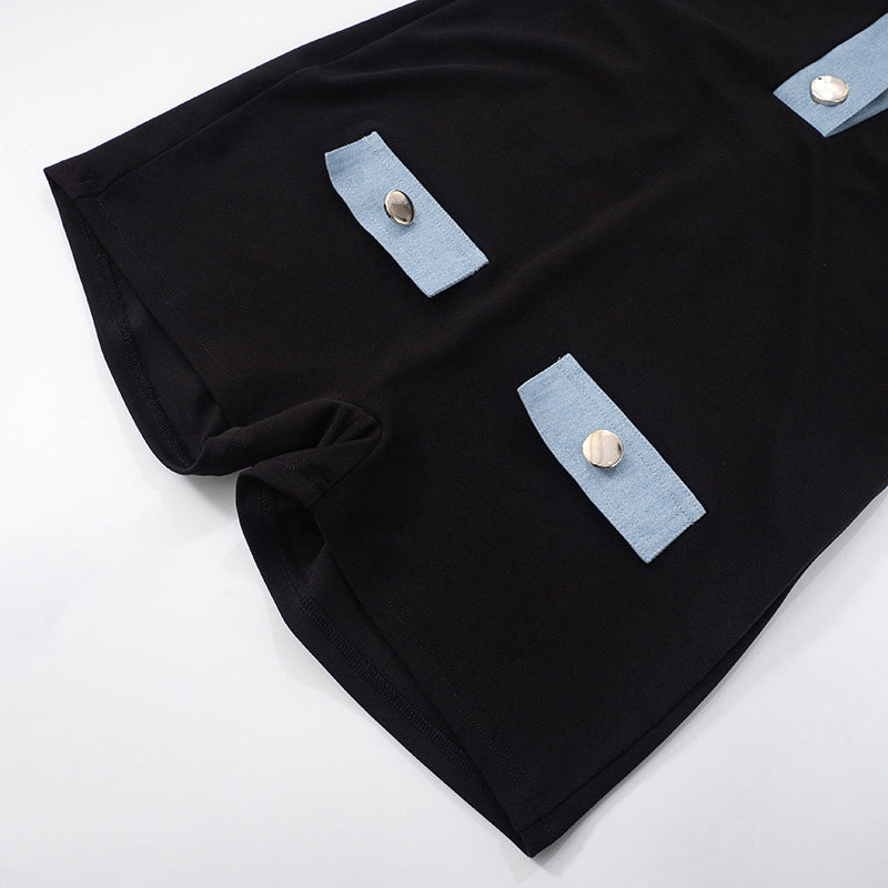 This is a Black & Denim Colorblock Jumpsuit. Crafted with a sleek black body, it features contrasting light-wash denim accents: a collar, button-front placket, and patch pockets that add texture and visual interest.