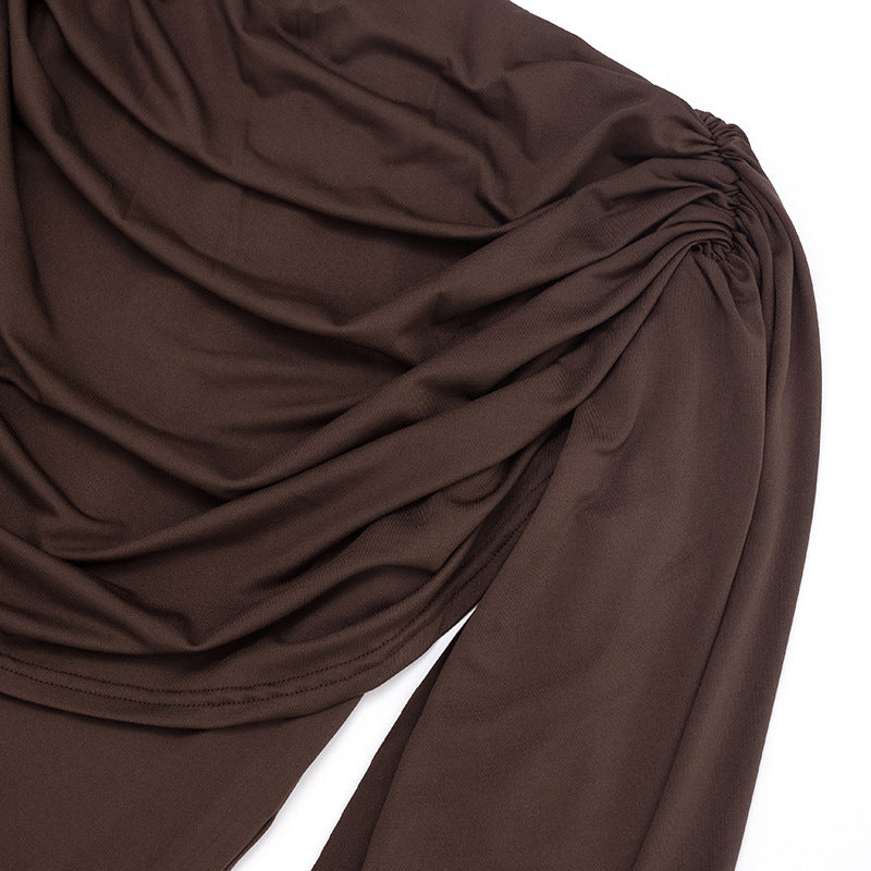 2505 design of Draped Collar Long-Sleeve Jumpsuit. Made from stretchy, form-flattering fabric, this jumpsuit features a dramatic draped collar that drapes elegantly over the shoulders. Its long sleeves and high-waisted fit create a perfect silhouette.