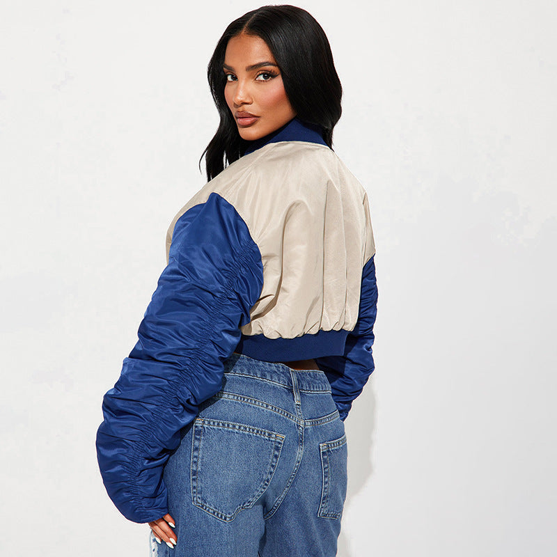 This LA Puff Sleeve Bomber Jacket features a classic varsity-inspired cut with a bold LA embroidered logo at the chest. The puff sleeve design adds a modern twist, while the blue collar, cuffs, and waistband create a striking contrast against the beige body.