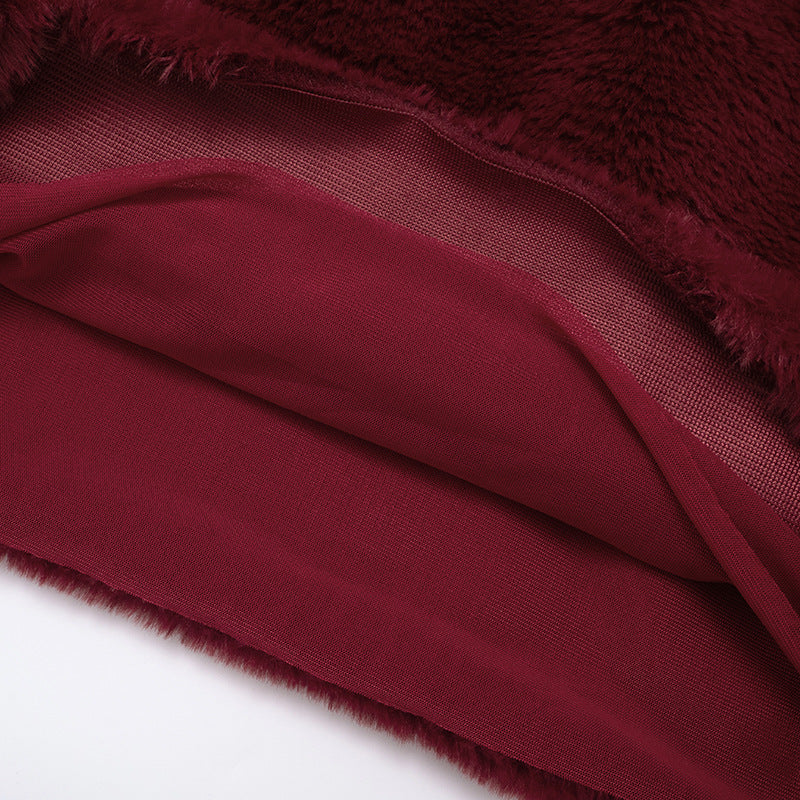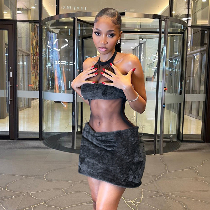 This eye-catching dress features a halter neck collar with fuzzy trim for a touch of luxury, while the sheer mesh bodice adds a hint of allure. The fuzzy A-line skirt is both comfortable and stylish.