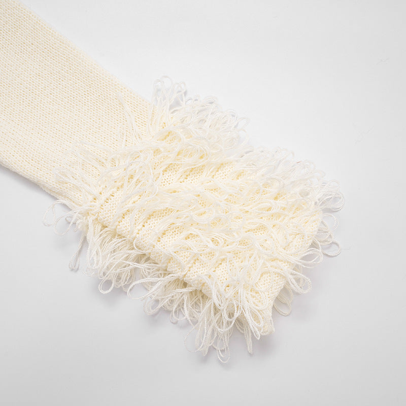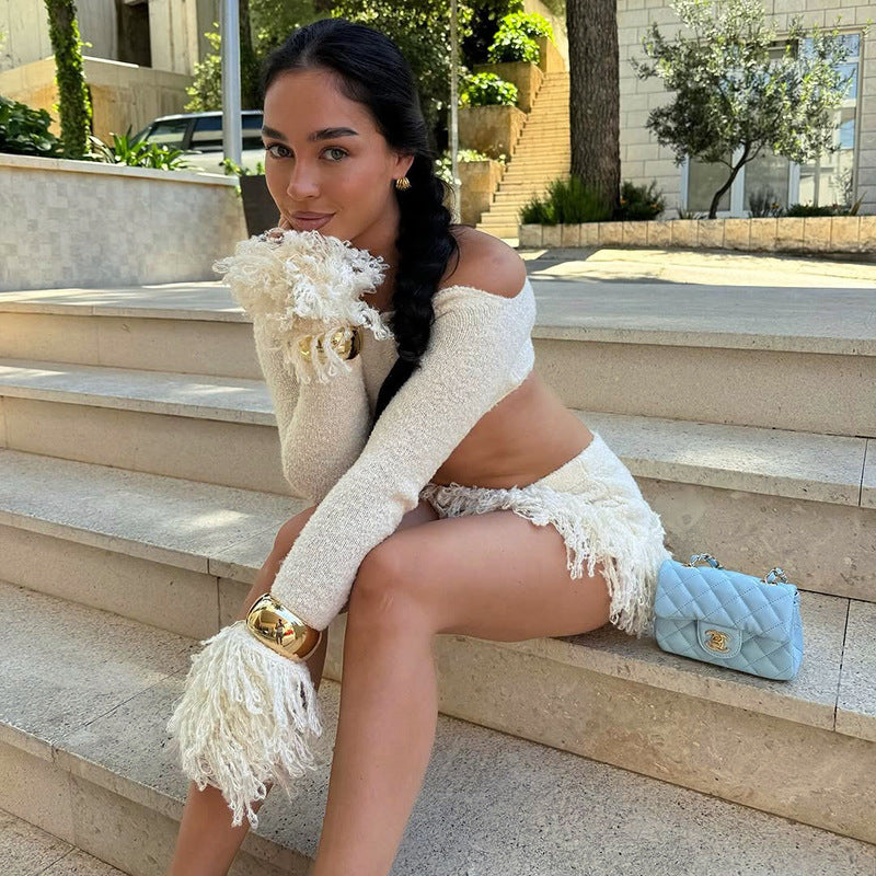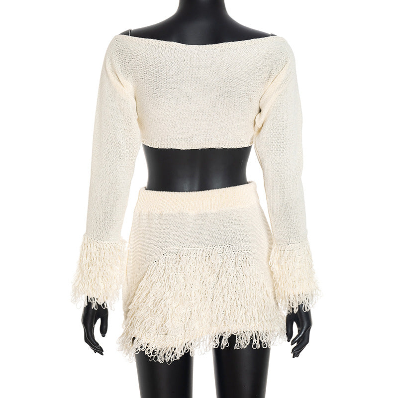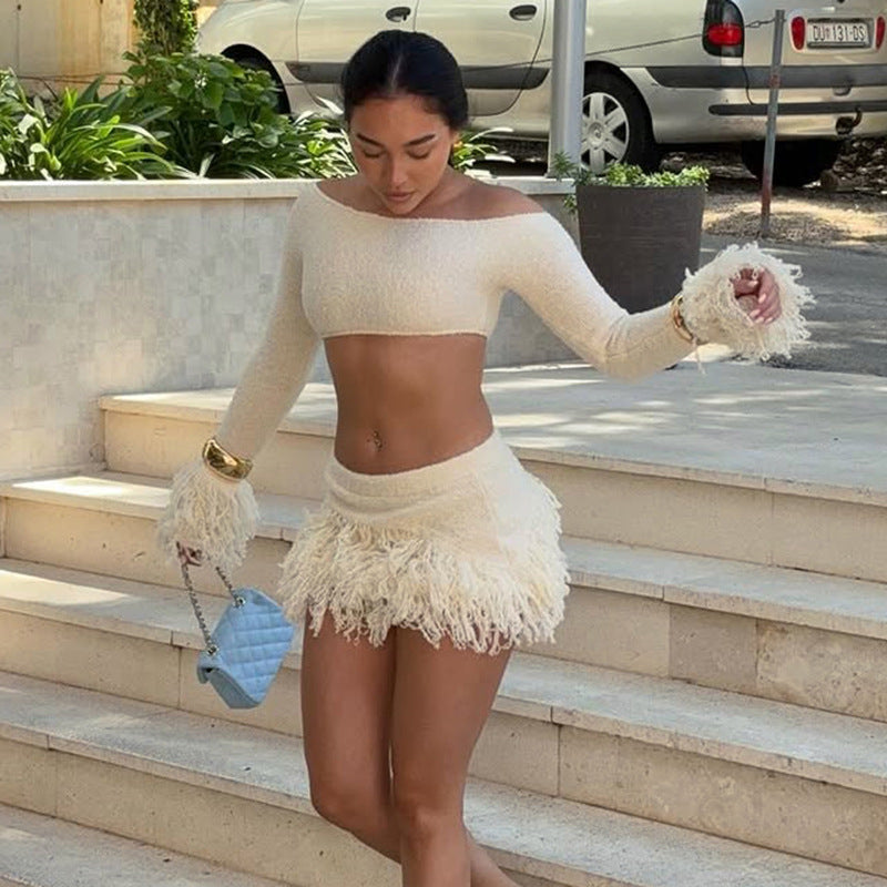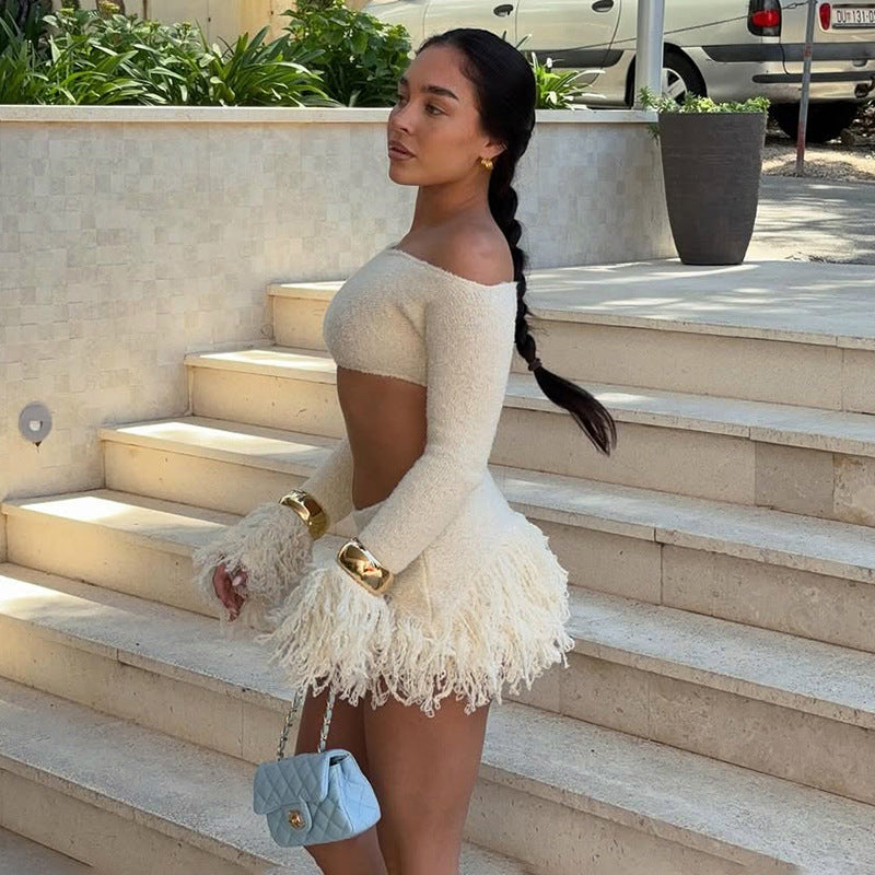 The set features an off-the-shoulder crop top with long sleeves and fringe trim at the cuffs, paired with a high-waist A-line mini skirt. Complete the look with a mini shoulder bag, which is ideal for day-to-evening wear.