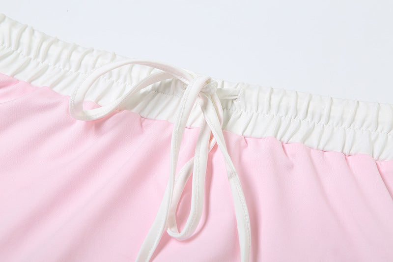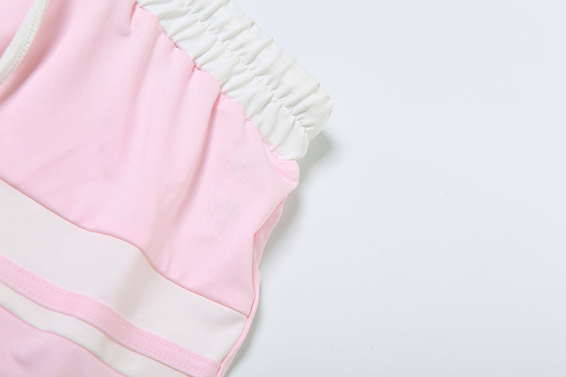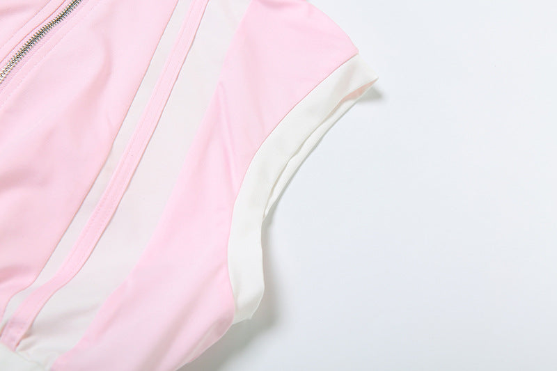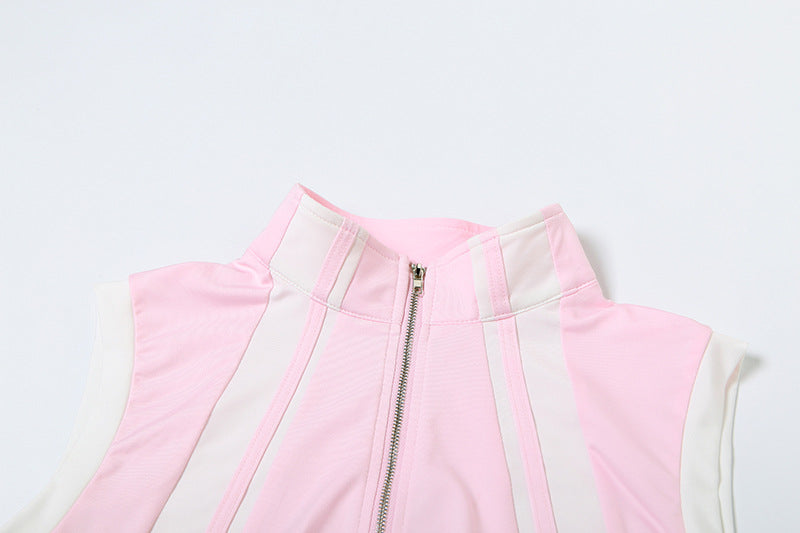 This outfit consists of a sleeveless crop top and a mini skirt, both in a lovely pink color with white stripes as accents. The top features a high neckline and a front zipper, adding a touch of modernity. The skirt has an elastic waistband with a drawstring, ensuring a comfortable fit. Overall, the set gives off a sporty yet chic vibe, perfect for a stylish and casual look.