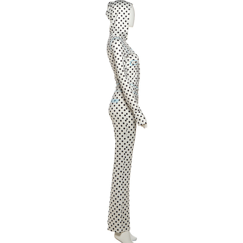 This polka dot two-piece outfit comes in both black and white color options, pairing a hooded crop top with high-waisted flared pants. Ideal for casual outings, brunch with friends, or weekend errands. Style the set with sneakers for a laid-back vibe, or dress it up with heels for a fun, trendy ensemble.