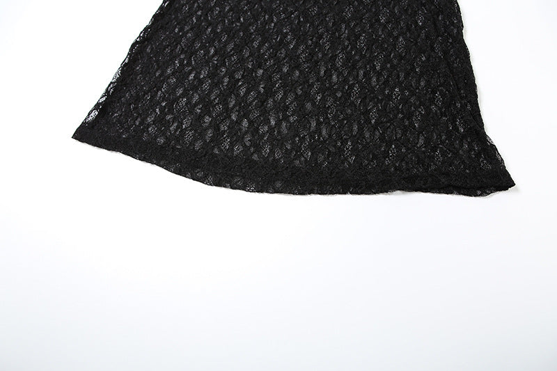 The outfit features a white strapless bikini top with a cute starfish detail at the center, paired with a long, sheer white lace skirt. The skirt has an elegant design with a ruched waistband that adds a touch of sophistication.