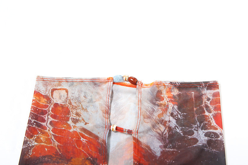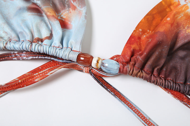 This is a set of swimwear with a vibrant and artistic design. The top features thin straps adorned with colorful beads, and a unique cutout pattern in the front, showcasing a blend of colors like red, orange, and blue, resembling an abstract painting. The bottom is a bikini bottom with similar bead decorations and a tie - side design, complementing the top perfectly.