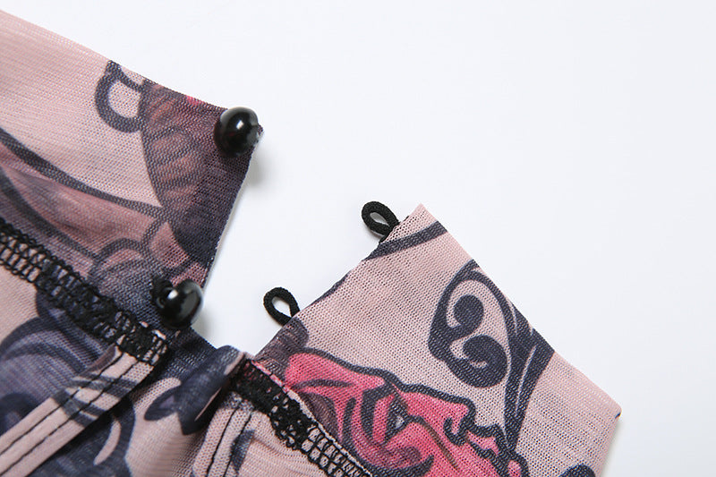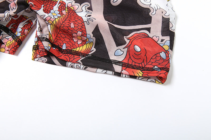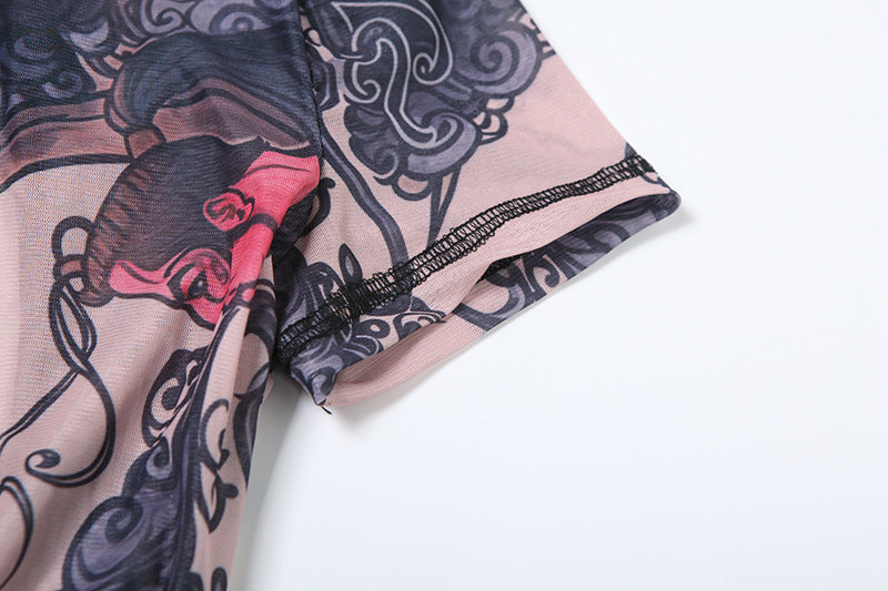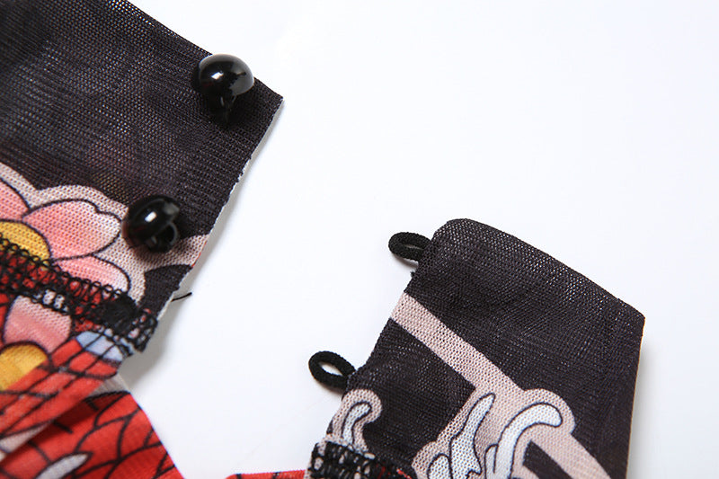 This eye-catching romper blends edgy tattoo-inspired prints with a sleek, body-hugging design. It features a high collar, short sleeves, and a dramatic deep backless cut for a striking silhouette. The slim-fit short-leg design naturally lifts and accentuates your curves, making it perfect for nights out, themed events, or bold everyday styling.