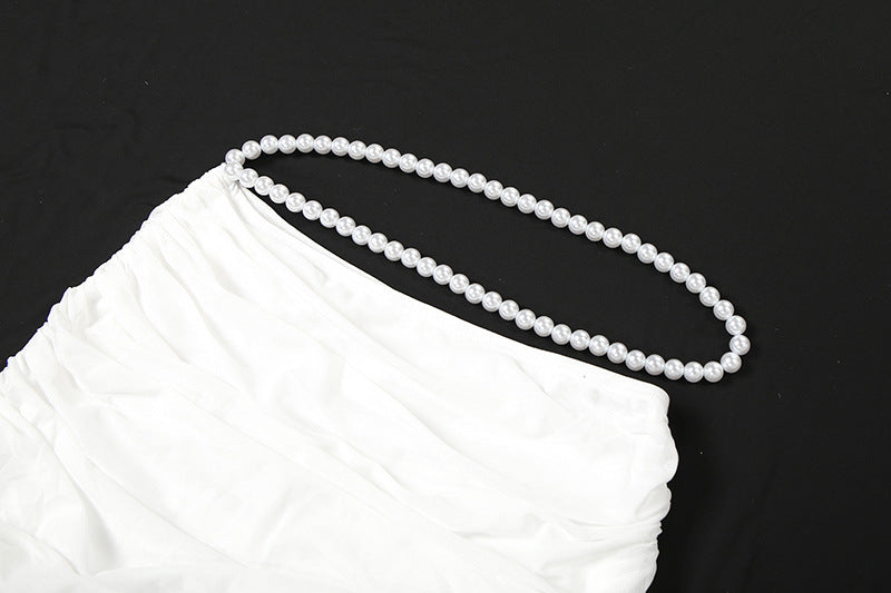 This two-piece set pairs a halter-neck crop top with a low-waisted bodycon maxi skirt. The top features a ruched, strapless bust design, while the skirt leans into tight ruching and a sheer overlay that hugs curves closely. It includes a matching pearl waist chain to tie the look together—ideal for beach vacations, evening dinners, or upscale parties.