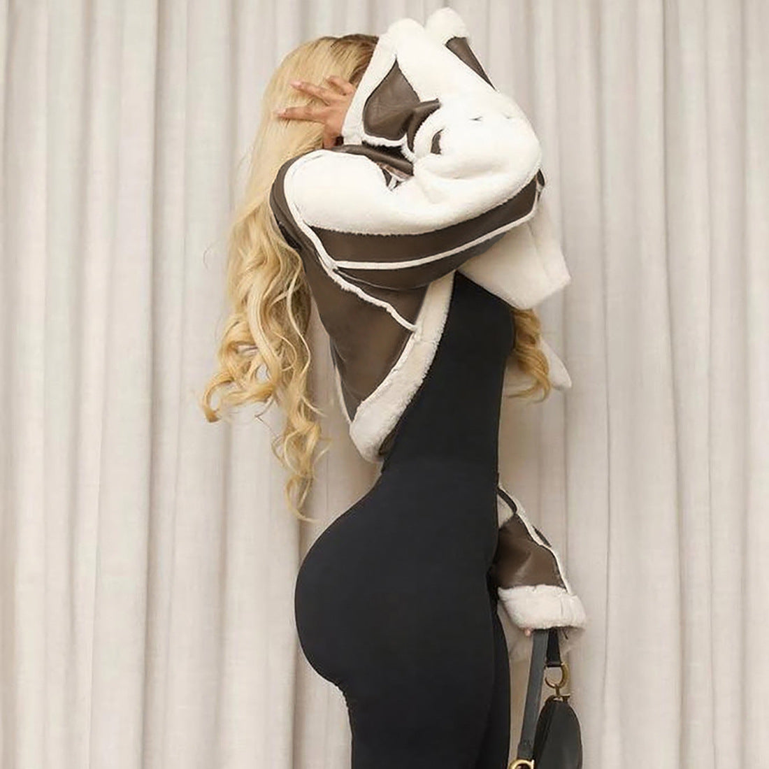 This women's jacket blends edgy PU leather with cozy faux shearling trim for a statement look. It features striped contrast detailing (smooth leather + fluffy fur) across the long sleeves, a wide shearling collar. It's perfect for pairing with high-waisted pants, skirts, or dresses for daily outings, concerts, or street-style ensembles.