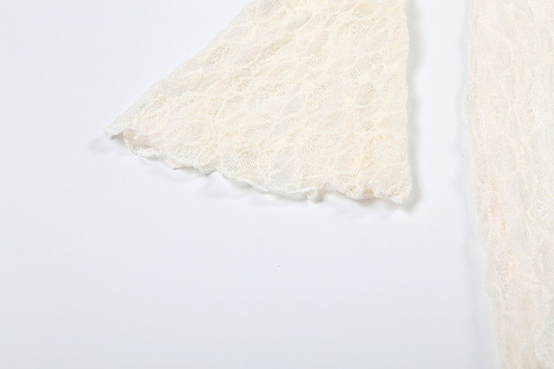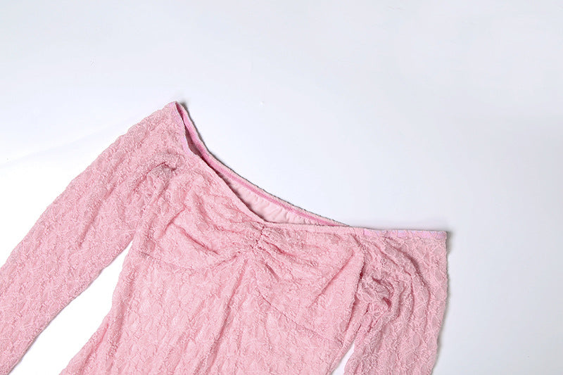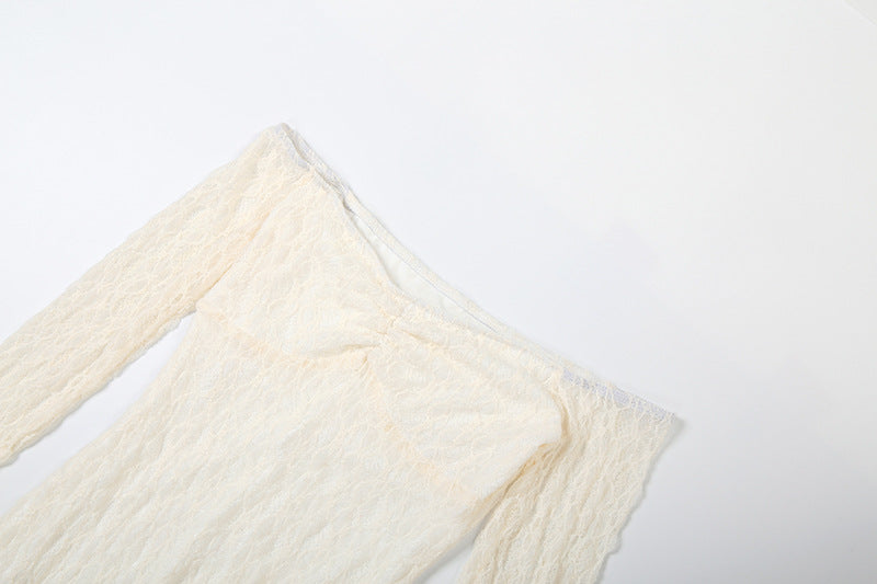 This long bell-sleeve formal evening gown features an off-the-shoulder neckline, long sheer lace sleeves with ruffled bell cuffs, and a fitted mermaid hem. This all-over lace sweetheart bust formal evening dress is ideal for weddings, galas, or red-carpet-style events.