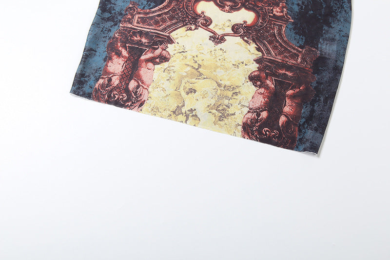 This mini dress features a full-body vintage print, a sheer mesh fabric, and a slim-fitting bodycon silhouette. The long sleeves and crew neck keep the look polished, while the dramatic print adds a gothic, eclectic vibe—perfect for parties, nights out, or styling with statement accessories.