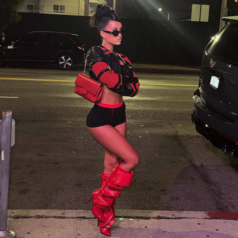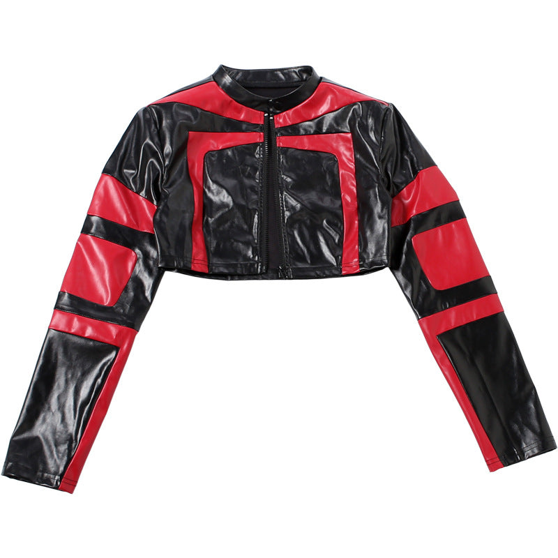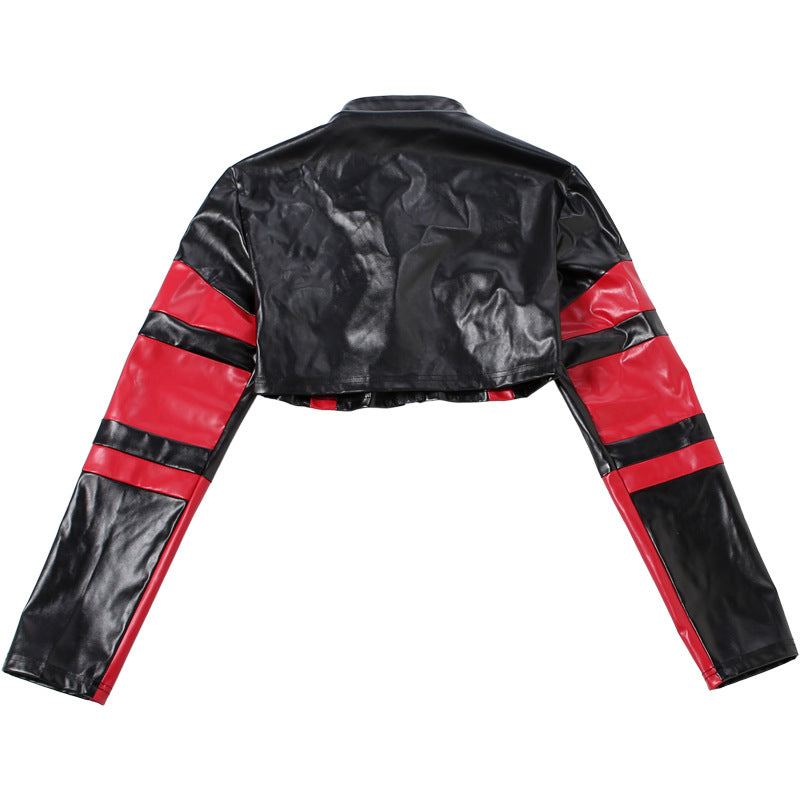 MB1150 Women’s Black & Red Color Block Cropped Faux Leather Moto Jacket