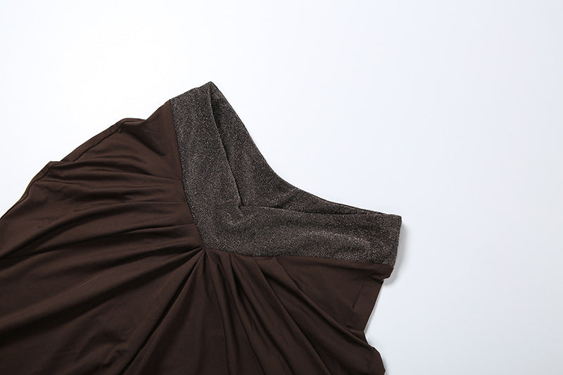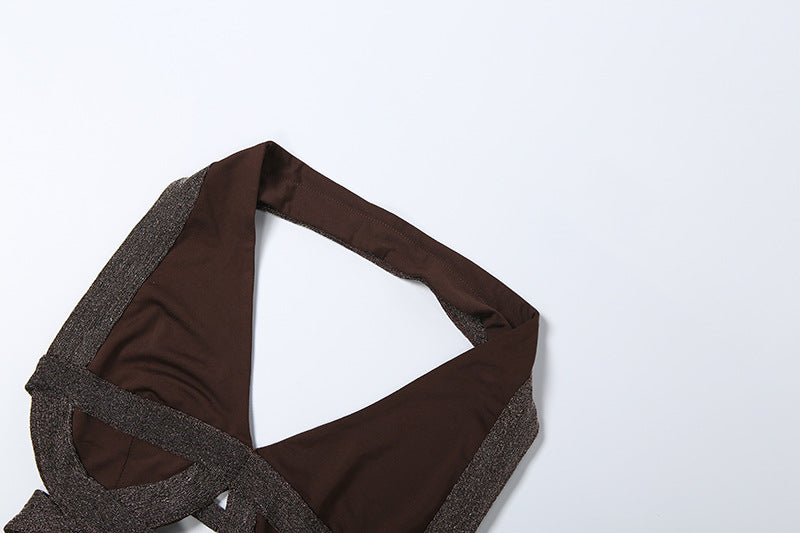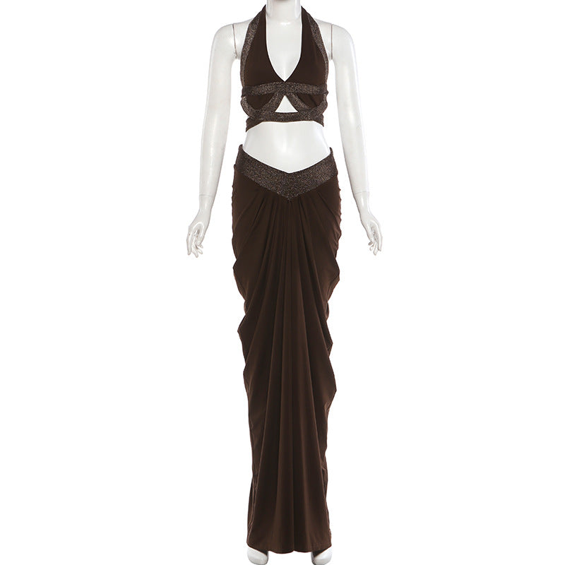 Make a striking impression in this brown halter neck cut out crop top and high waisted maxi skirt 2 piece set, a bold ensemble crafted for women who love sexy bodycon silhouettes with intricate details. The halter neck crop top features a deep V neckline and cut - out accents, adding a touch of edginess to the fitted design, while the high waisted maxi skirt with ruched detailing drapes elegantly over the curves, creating a fashion forward layered look.