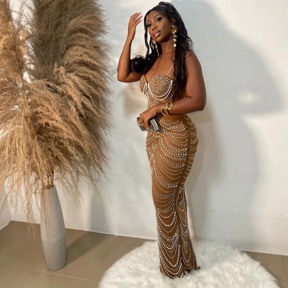 This women’s Art Deco-inspired rhinestone evening gown features delicate spaghetti straps, a sweetheart neckline, and an all-over cascade of hand-placed rhinestones and beads, making it a standout choice for formal galas, red carpet events, or black-tie ceremonies.