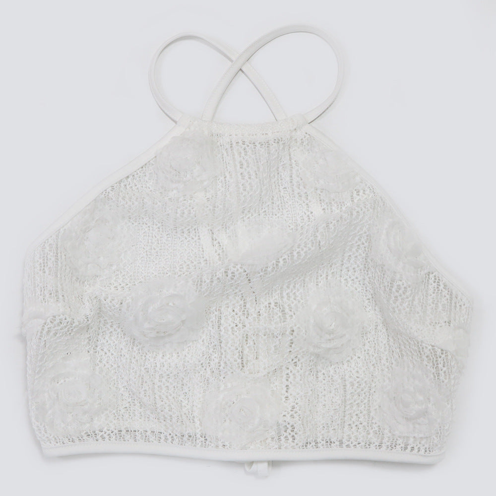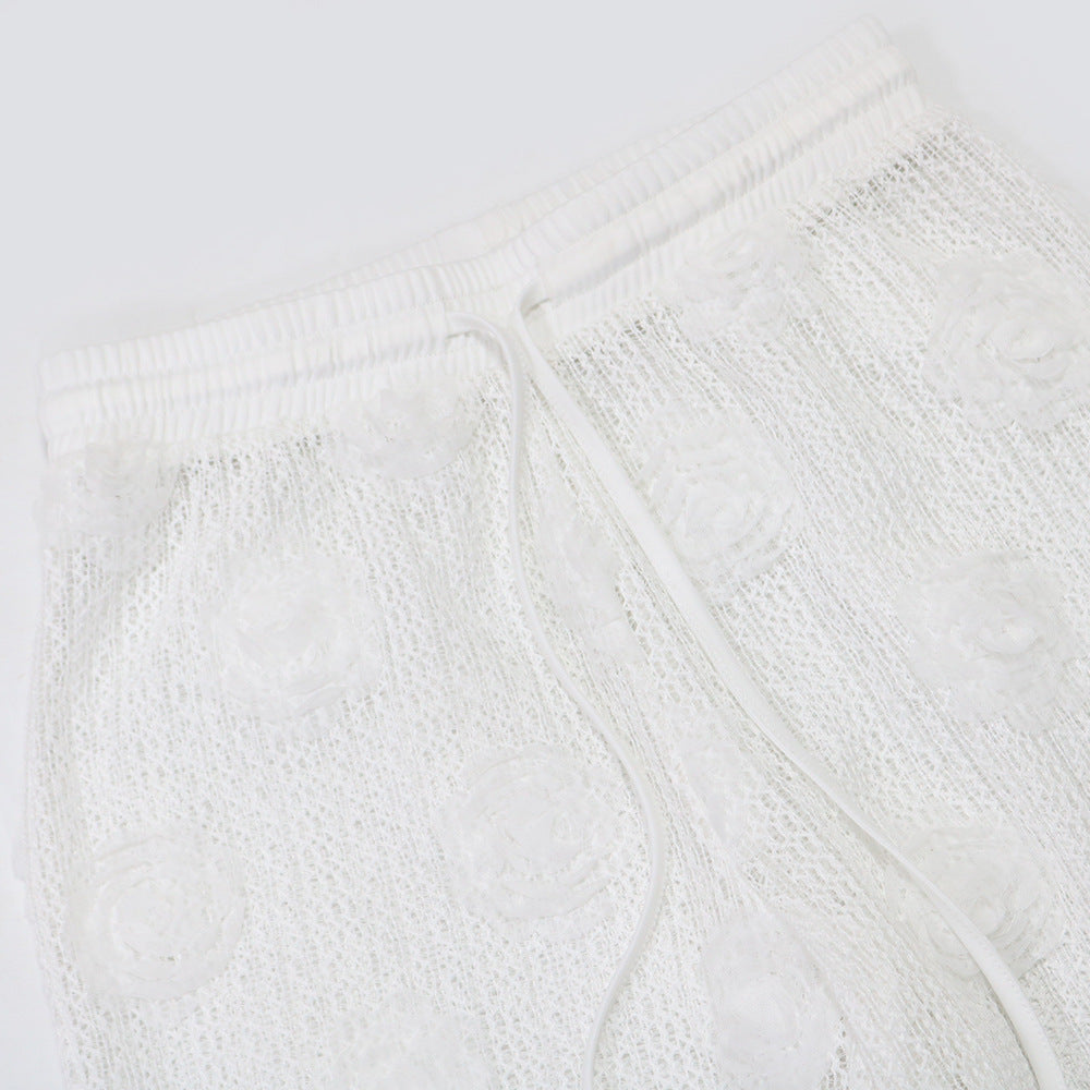 This set combines a halter crop top with wide leg pants. It features a sheer crochet fabric adorned with 3D rose embellishments. Paired with strappy heels and a woven clutch, it is perfect for date nights, brunch, or special occasions.