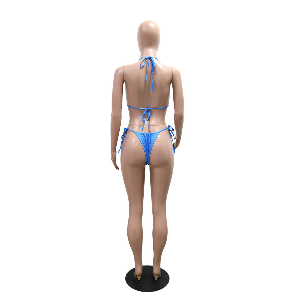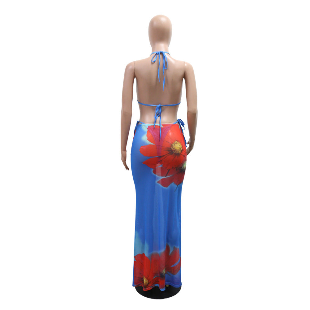 This three-piece beach set includes a halter bikini top, a tie-side bikini bottom, and a matching maxi cover up skirt. The maxi skirt doubles as a casual cover-up or a flowy beach outfit layer. It’s perfect for tropical vacations, pool days, or beach outings.