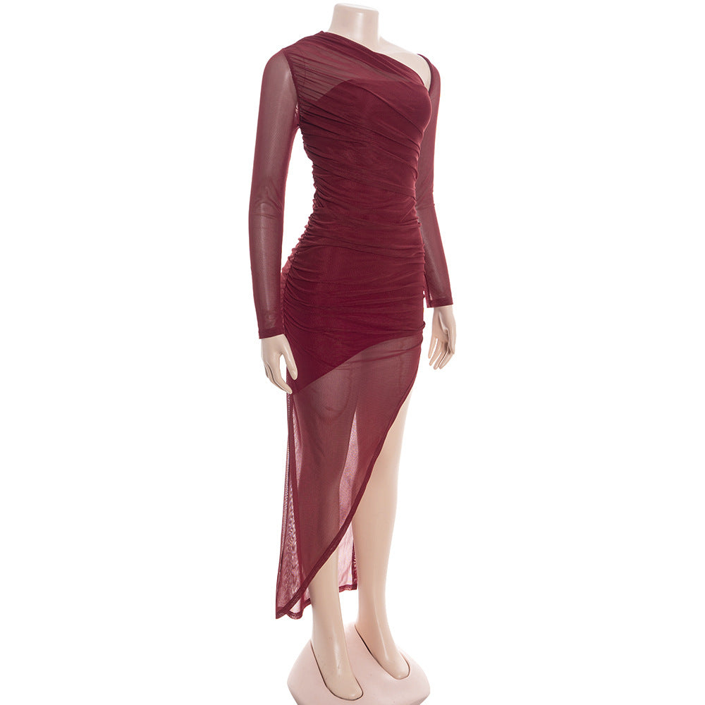 MB1320 One-Shoulder Mesh Long Sleeve Ruched Maxi Dress