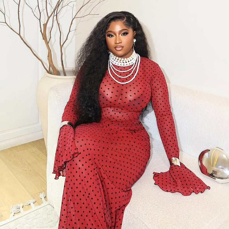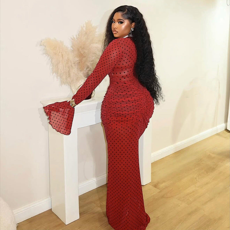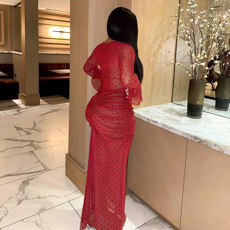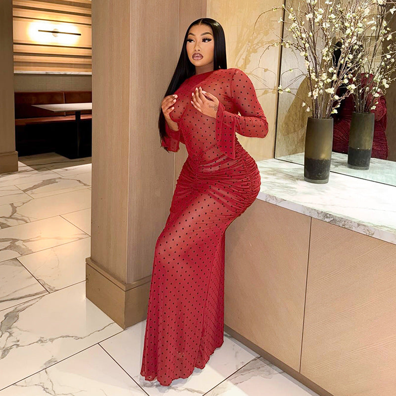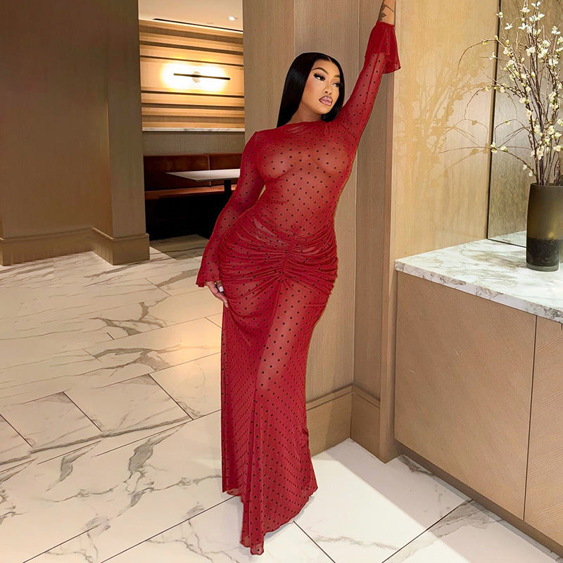 This women’s red maxi dress features sheer mesh fabric printed with classic polka dots, plus flared long sleeves and a ruched waist. The sheer material adds a playful, eye-catching edge, while ruched waist detail flatters your silhouette. This women's party outfit is perfect for making a statement at night outs, club events, or bold formal gatherings.