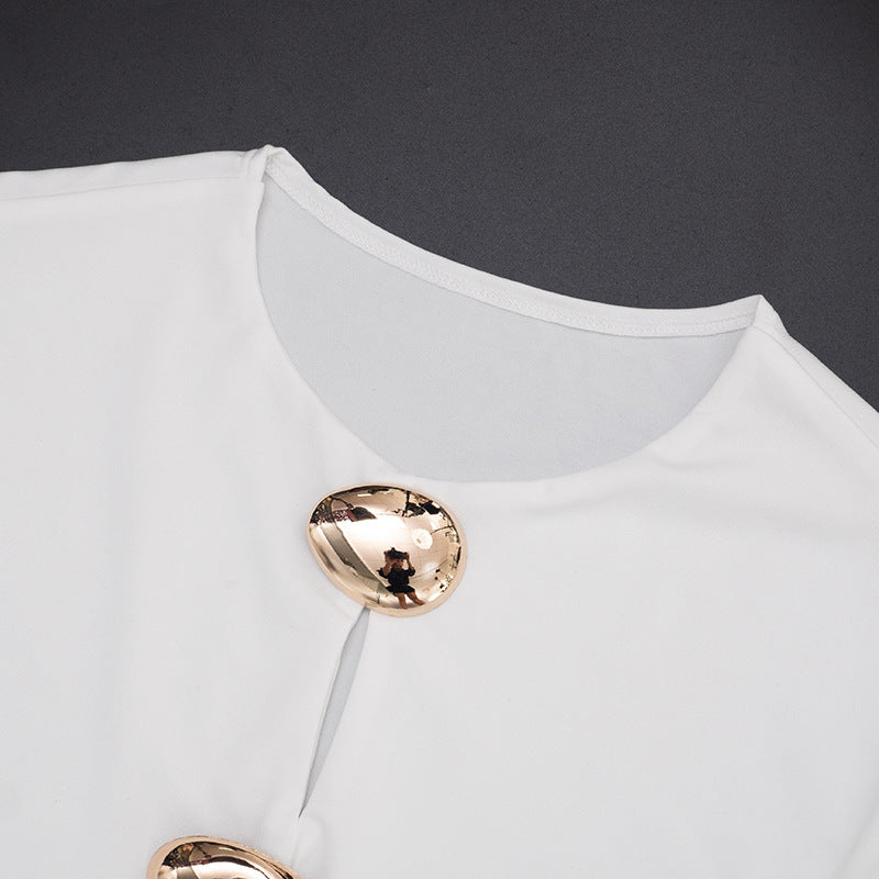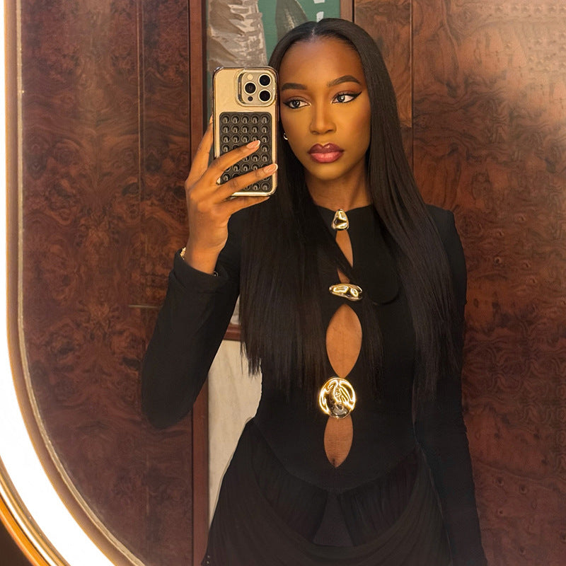 This bodycon party outfit is a standout addition to your evening or party wardrobe. It features a sleek bodycon fit, a striking front cutout, three metallic gold hardware pieces. The ruched mini skirt creates a figure-hugging silhouette, making this dress works perfectly for date nights, club outings.