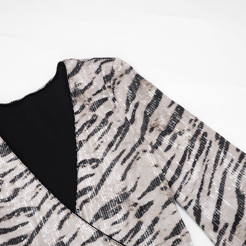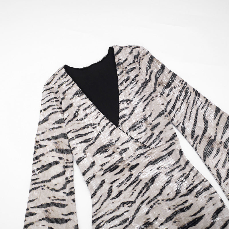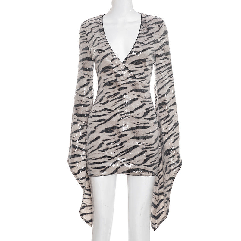 This head-turning mini dress combines snake print with all-over sequins for a party-ready look. It features a deep V-neck wrap front, figure-hugging silhouette, and dramatic flared bell sleeves. This women's dress is perfect for nights out, concerts, or special events.