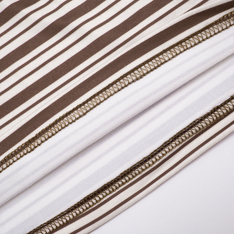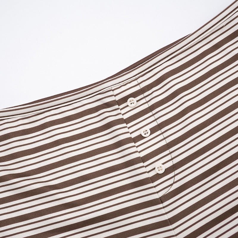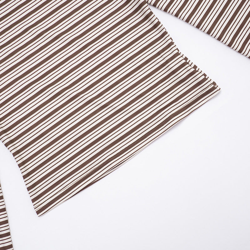 This cozy yet stylish two-piece set features a classic brown-and-white horizontal stripe pattern, designed for casual comfort and everyday versatility. The set includes an off-the-shoulder long sleeve top and high-waisted shorts. Made with soft, breathable fabric, it’s ideal for loungewear, brunch outings, or relaxed weekends.