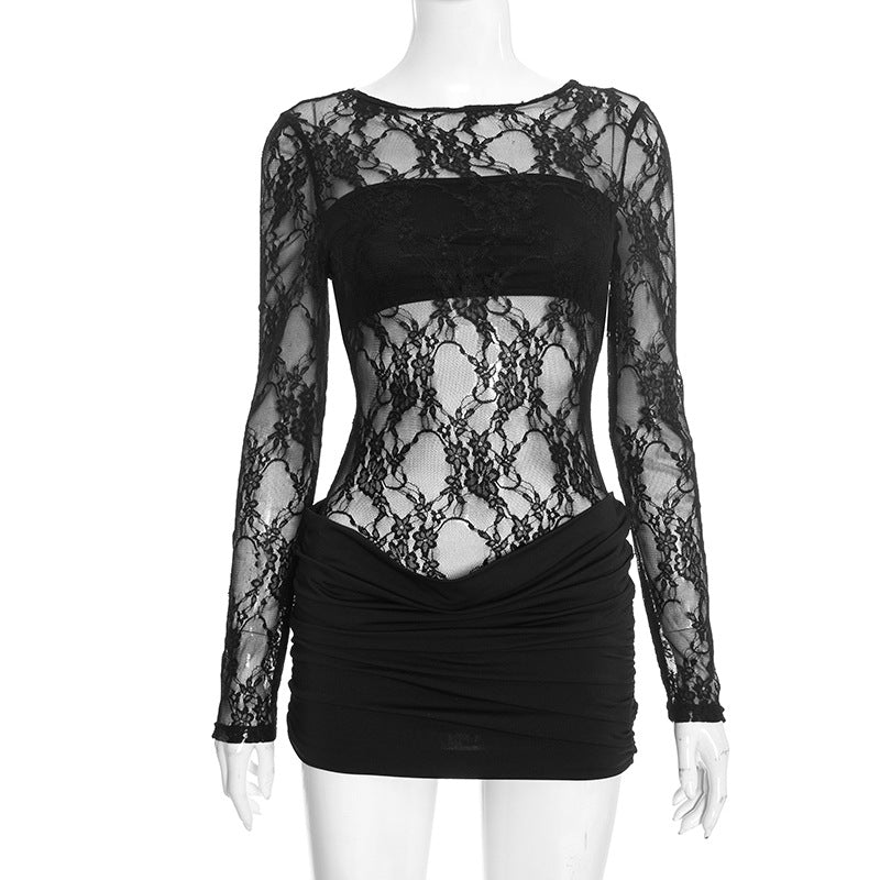 This black mini dress combines sheer floral lace with a figure-hugging bodycon fit. It features long sheer lace sleeves, a partially sheer lace bodice, and a ruched skirt. The all-black design keeps the look sleek, making it ideal for nights out, cocktail events, or dressy casual occasions.