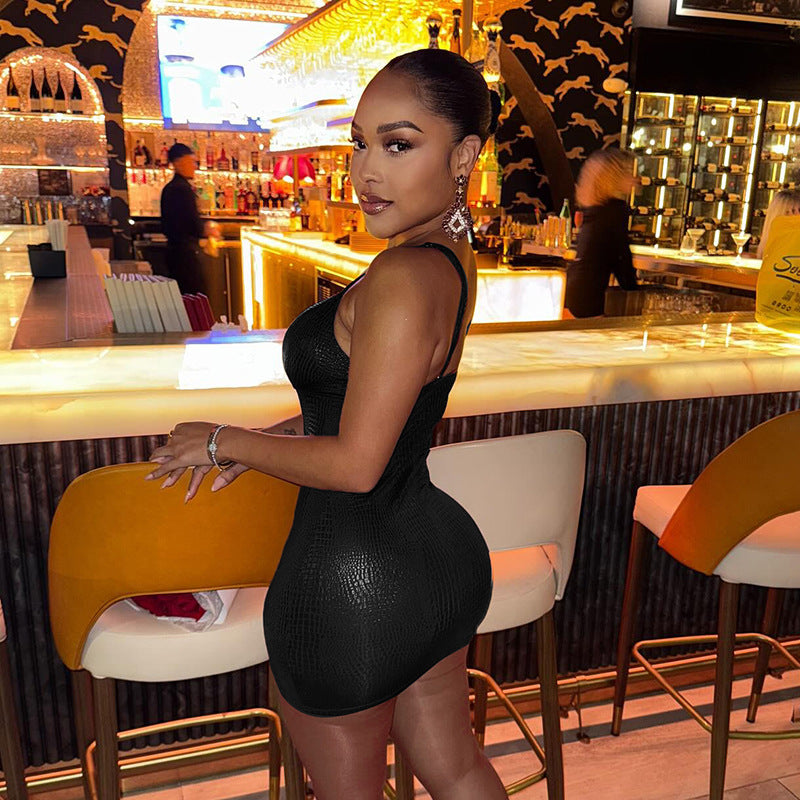 This crocodile print mini dress merges edgy animal print texture with feminine silhouette, featuring a sweetheart neckline, thin adjustable spaghetti straps, and a bodycon fit that hugs curves.