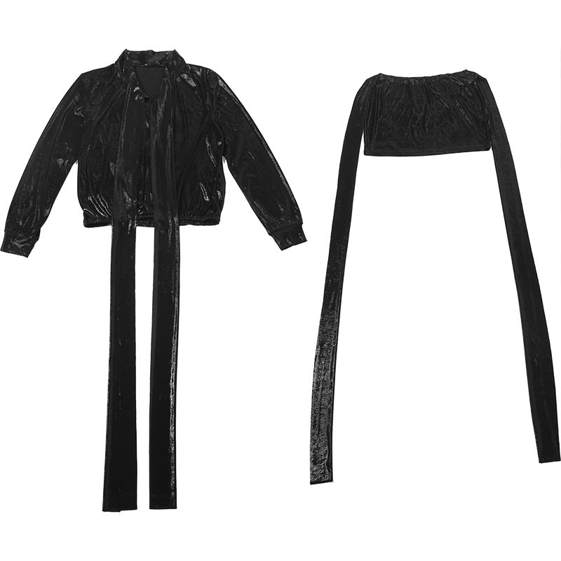 This 2-piece outfit uses shiny metallic fabric, it pairs a long-sleeve wrap top (with a deep V neckline and dramatic flowing sashes that drape down the front) with a form-fitting bodycon mini skirt. The glossy material adds a bold, eye-catching touch—great for night outs, club events, or special occasion parties.