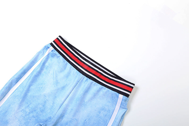 This sky blue two piece tracksuit for women is crafted from soft velour fabric in a unique acid-wash finish and detailed with contrast striped ribbing at the cuffs and waist.