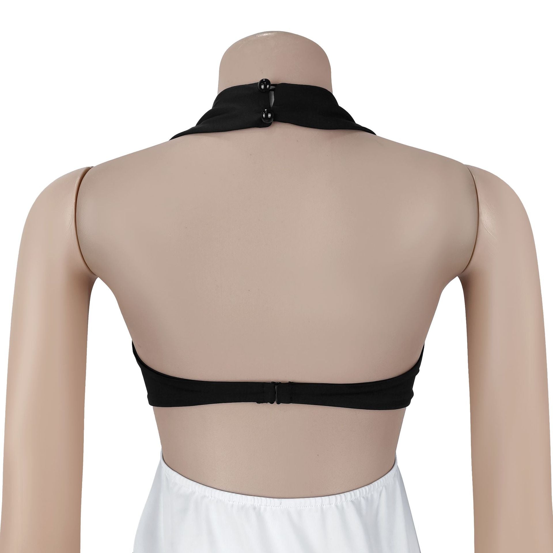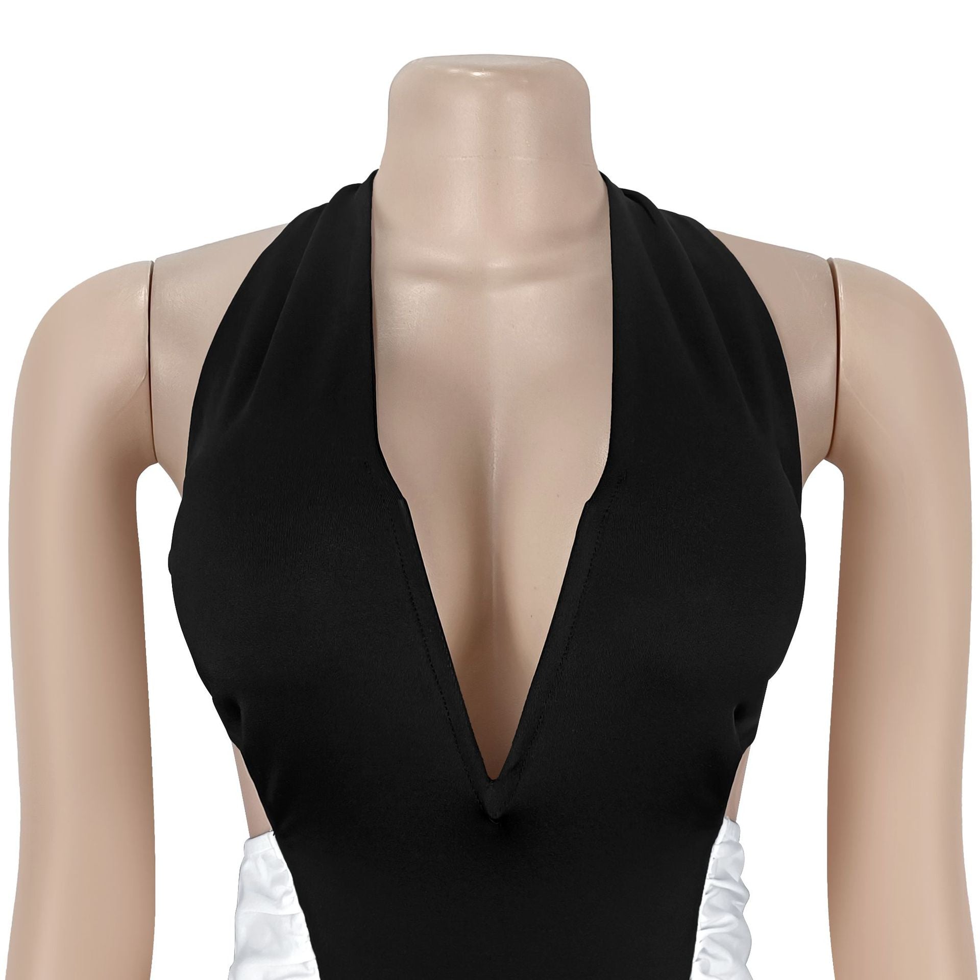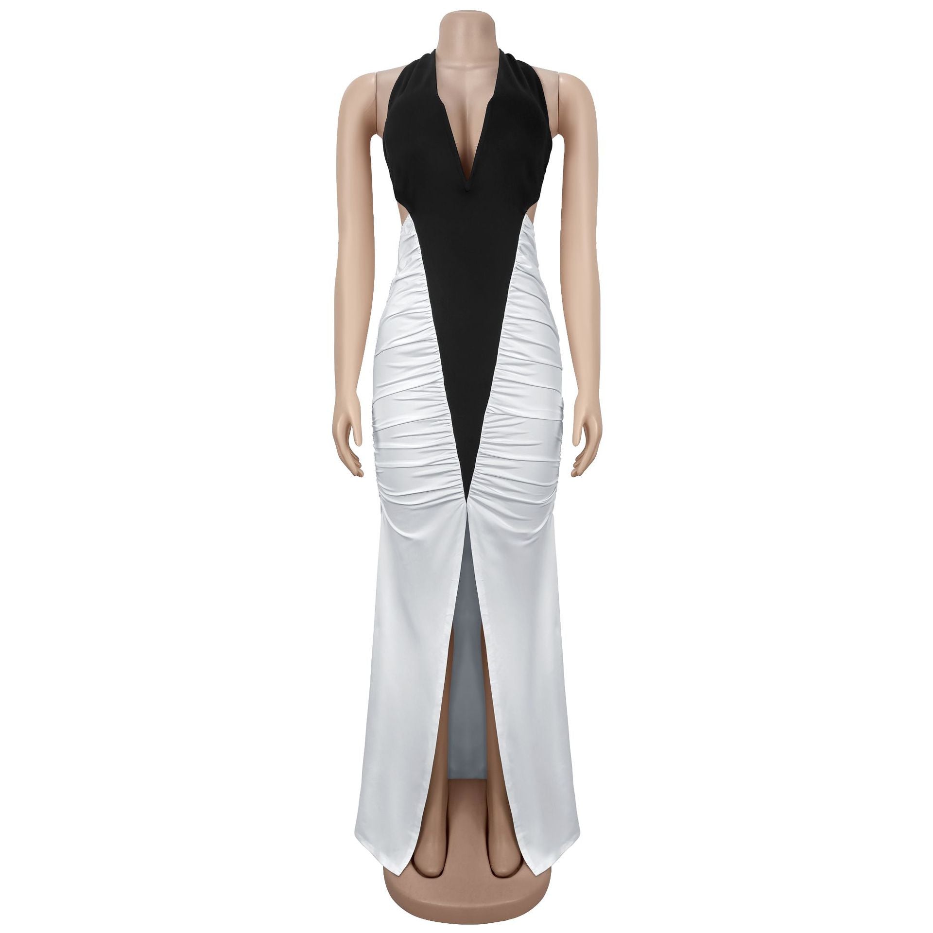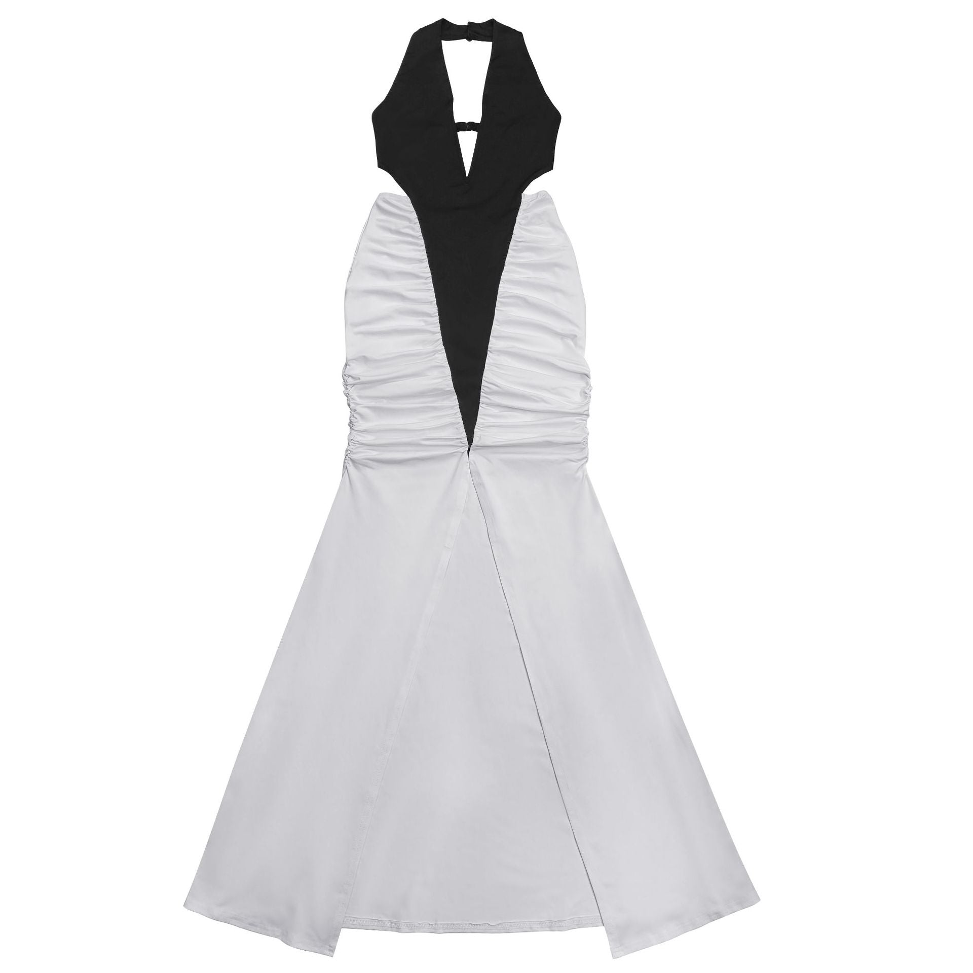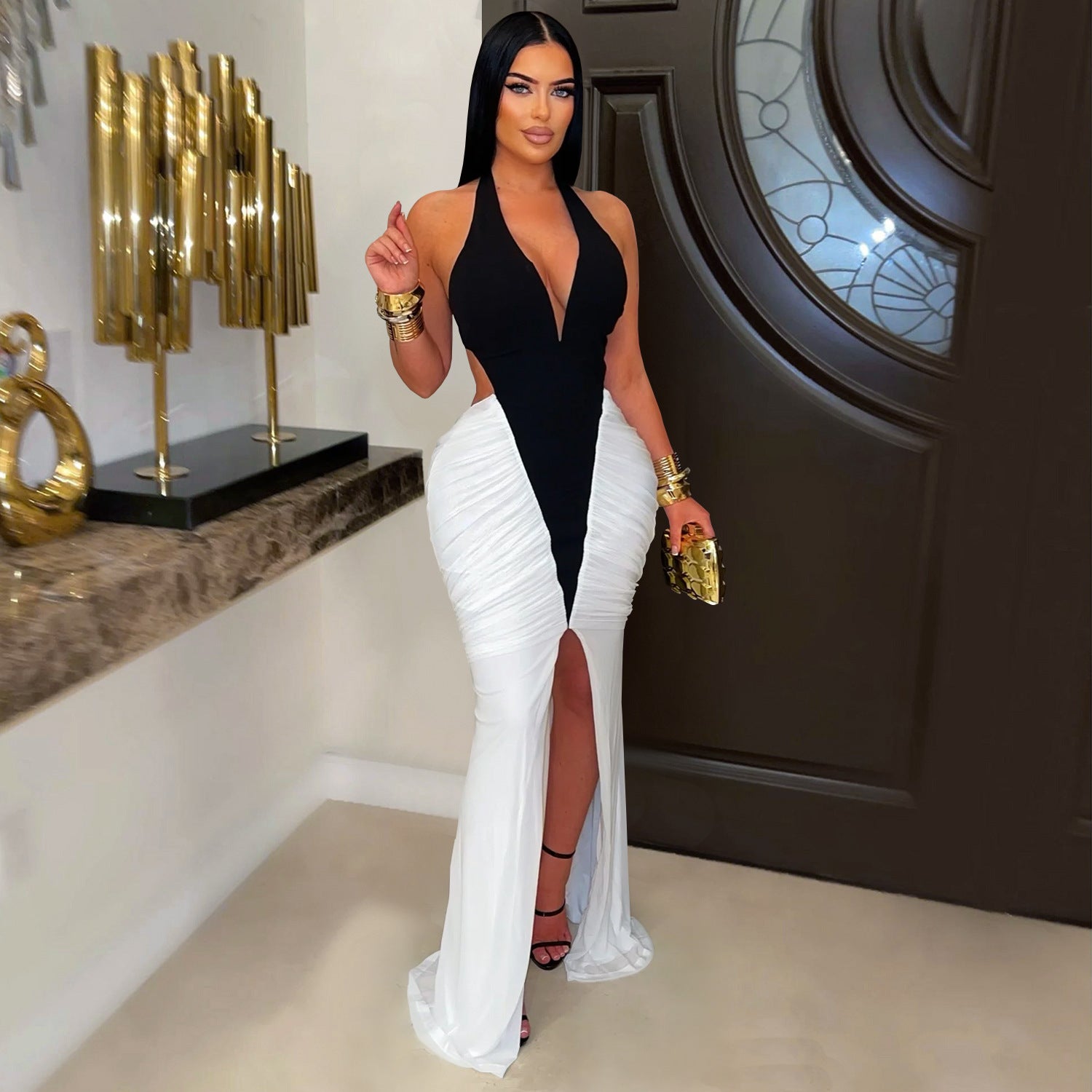 This black-and-white maxi dress leans into a bold color-block design. It features a halter neckline, a deep plunging V front, and a cutout open back. The white skirt section adds texture with ruched detailing, while a high side slit brings movement to the silhouette. Its figure-hugging fit flatters your curves, making it a great pick for formal dinners, cocktail parties, or special occasion outings.