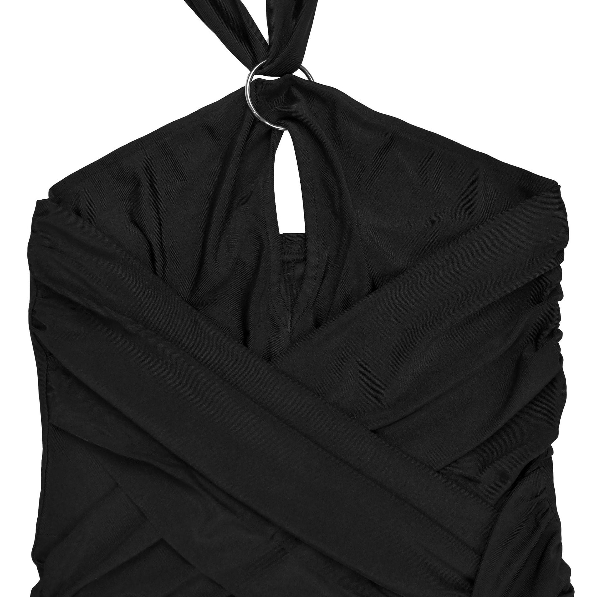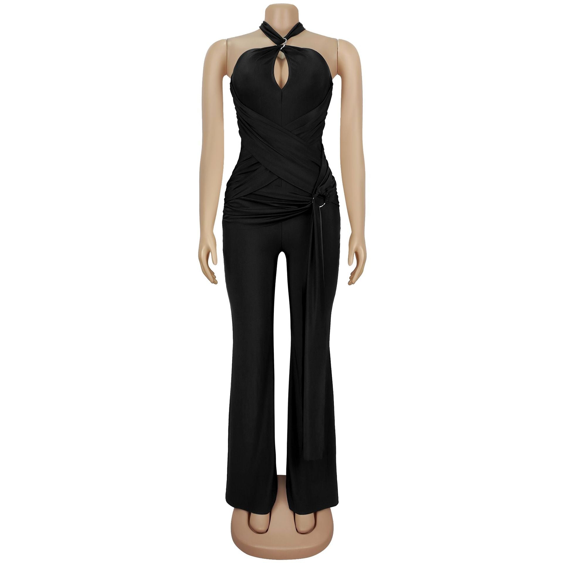 This jumpsuit leans into a bold, rich hue and a sleek halter neck design, paired with an eye-catching chest cutout. Crisscross ruched details hug your silhouette closely for a flattering, tailored fit, while the flowy flared legs add a dramatic, elegant touch to the look. Made with soft, stretchy fabric, it’s comfortable enough for formal dinners, cocktail parties, or special occasion gatherings.