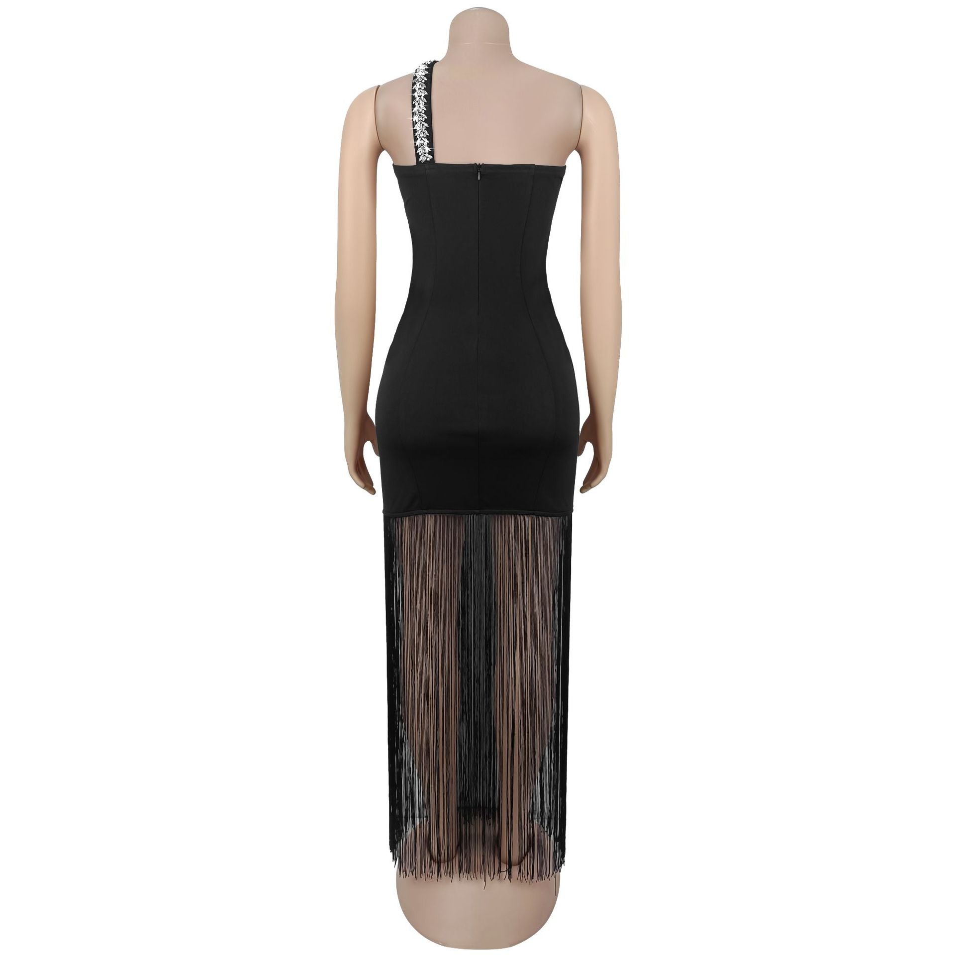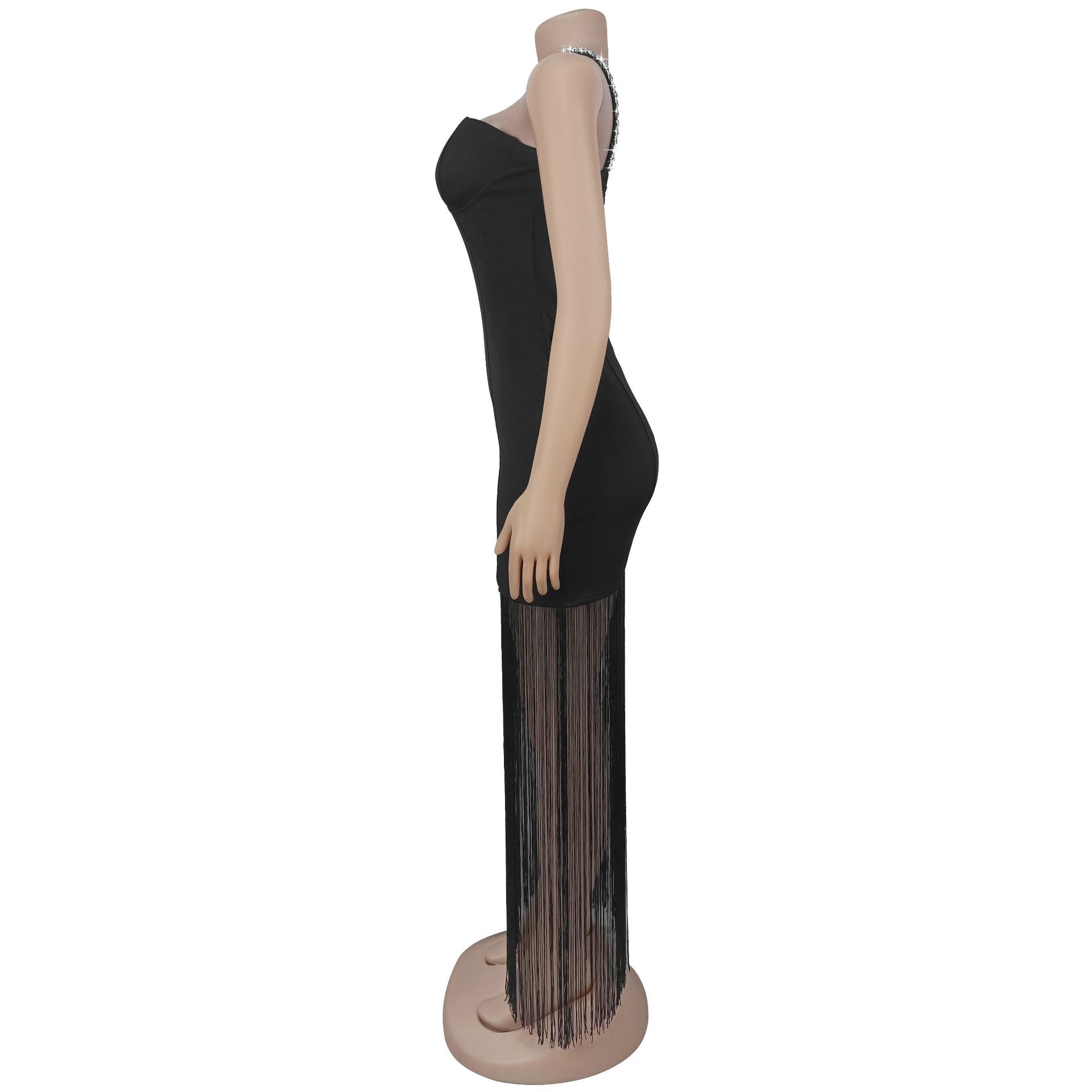 This black formal dress features a one-shoulder design topped with sparkling rhinestones, pairing a sweetheart strapless bust. Its floor-length fringe hem adds flowing movement with every step. Stretchy fabric keeps it comfortable, making it ideal for gala events, cocktail parties, or upscale special occasions.