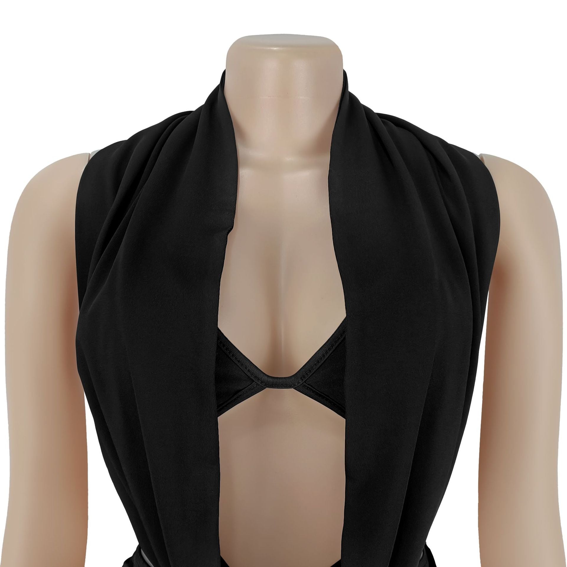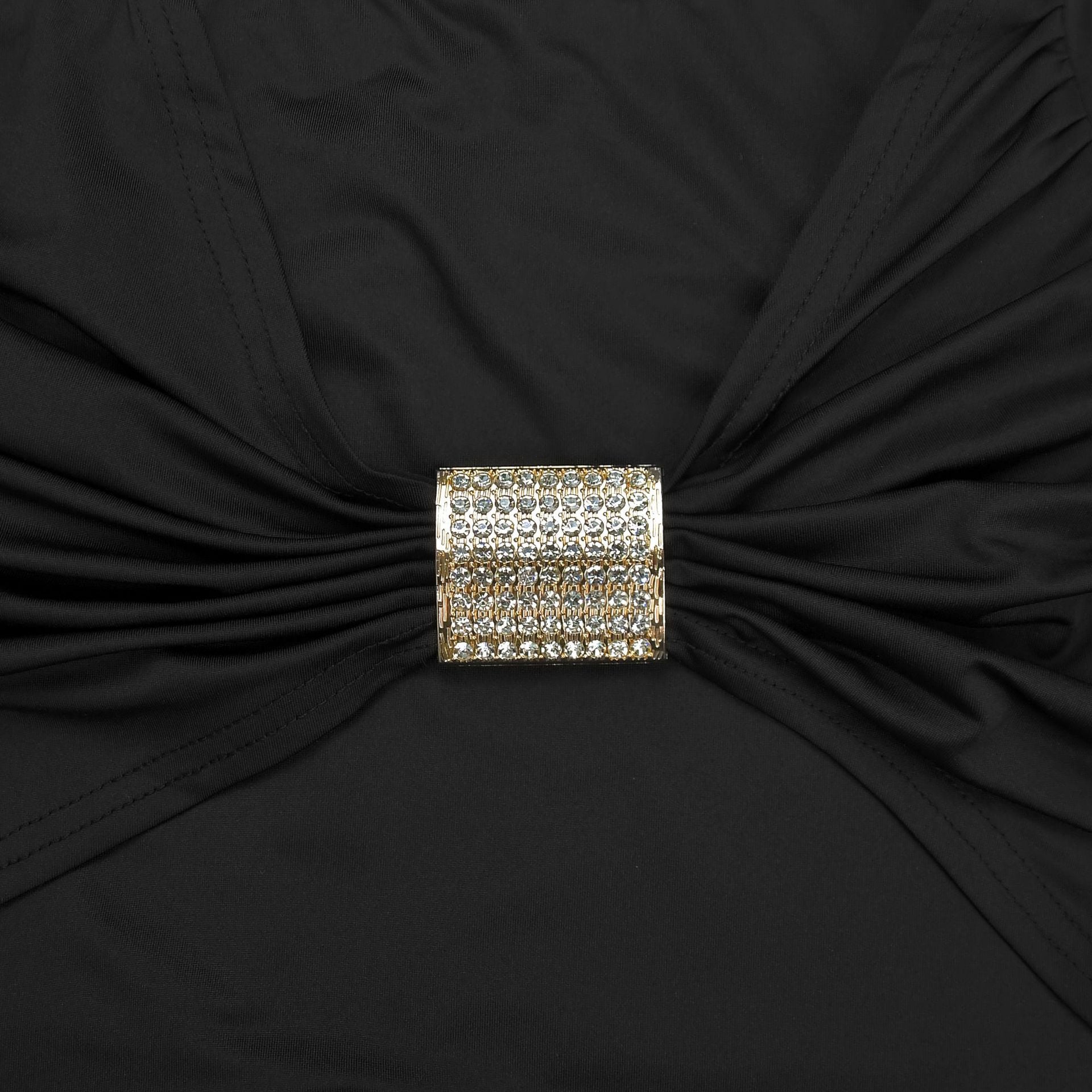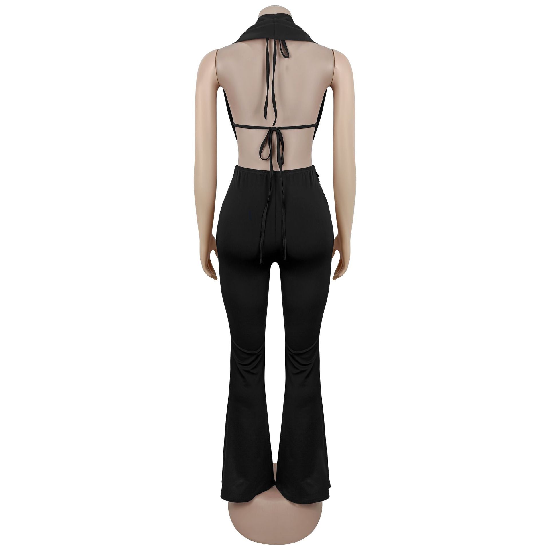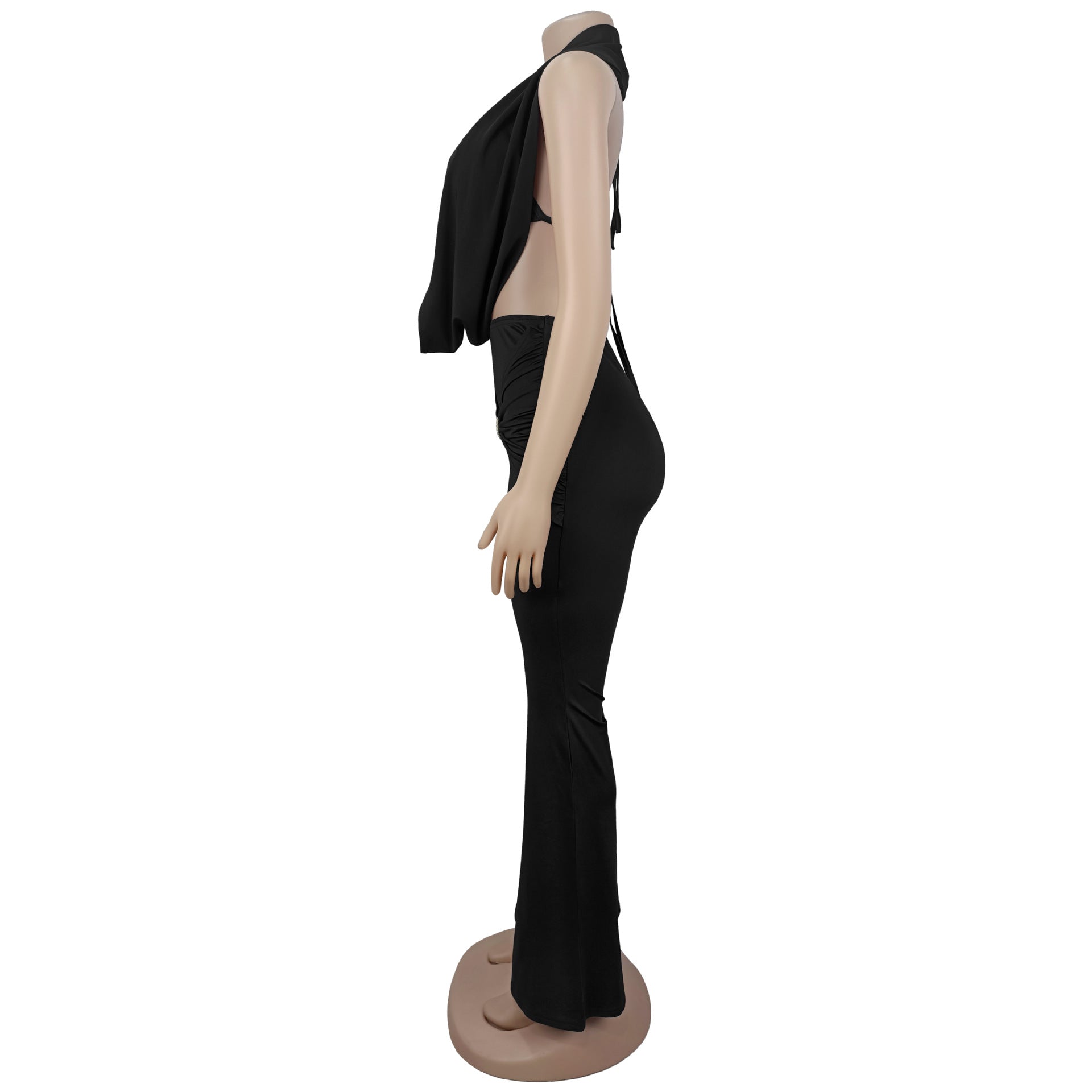 This sleek two-piece set caters to shoppers in search of a two-piece set for evening outings or romantic date nights. The draped halter top with a front cutout pairs with ruched high-waist flared pants and a crystal accent buckle, creating a look that fits perfectly for upscale dinner gatherings or weekend brunch with friends.