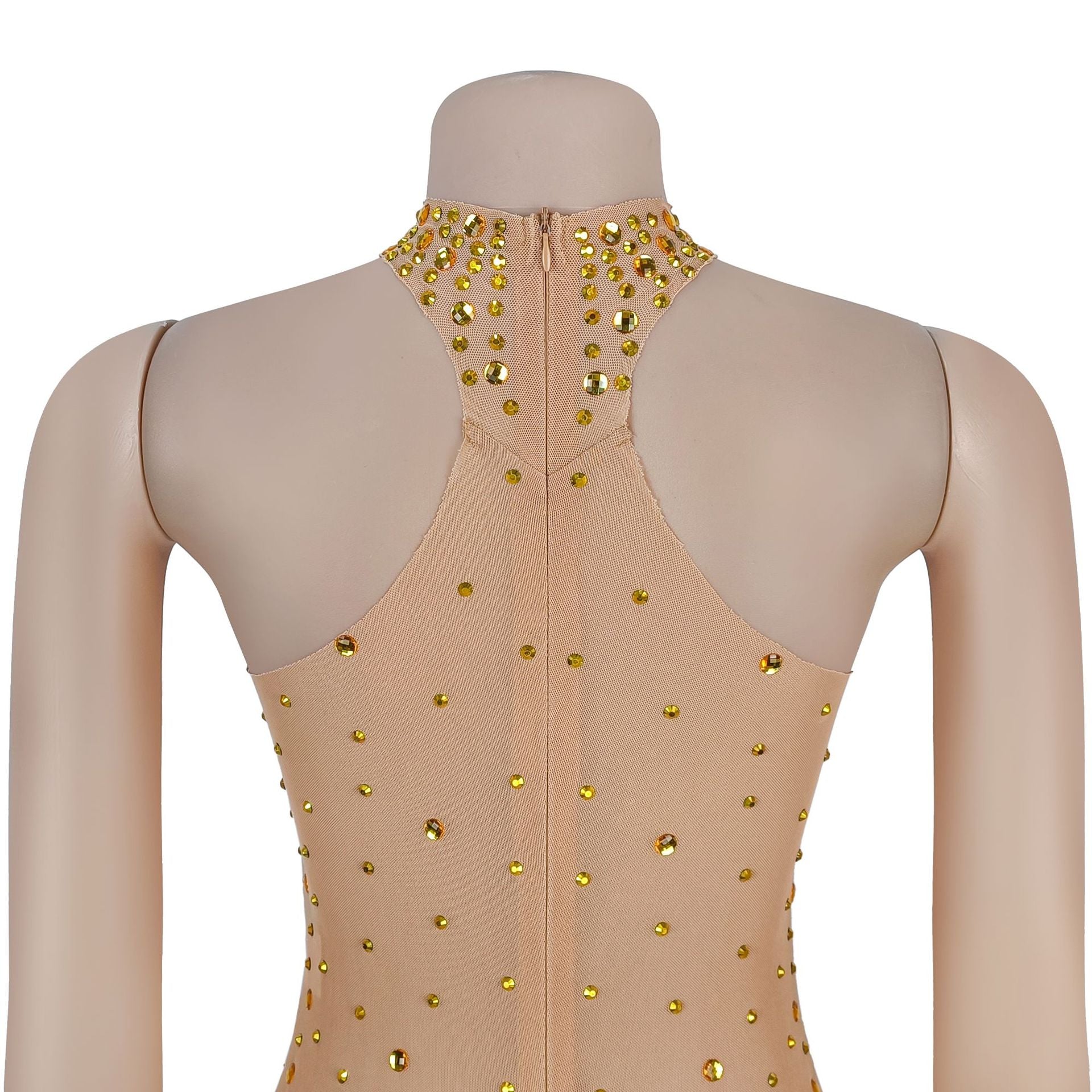 This women's sheer mesh gold rhinestone gown is a masterpiece that tailored for red-carpet moments and high-profile gatherings. The halter high neck silhouette frames the collarbone elegantly, while the all-over gold rhinestone embellishments—meticulously hand-placed on see-through mesh fabric—create a radiant, light-reflecting effect that shifts with every step, perfect for glamorous evening events and luxury party wear.