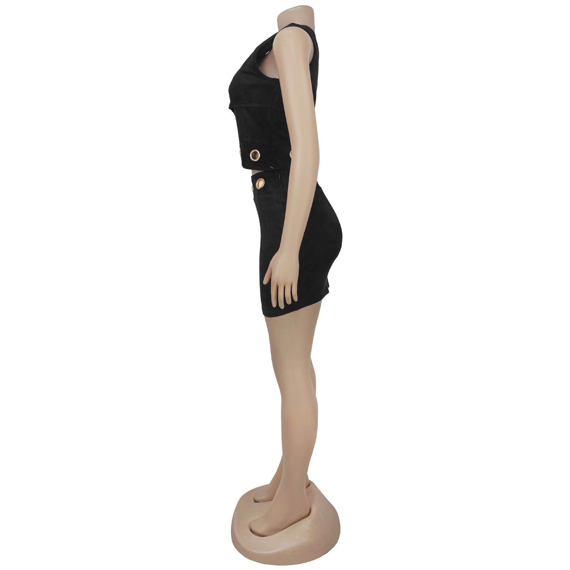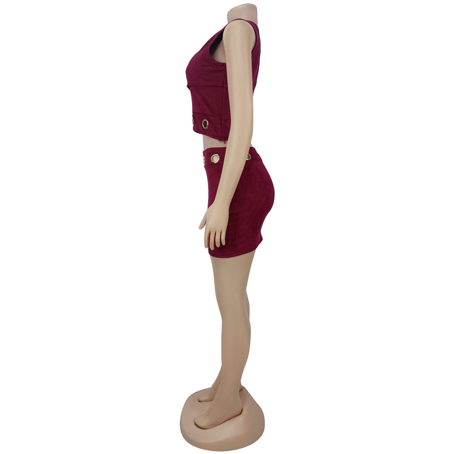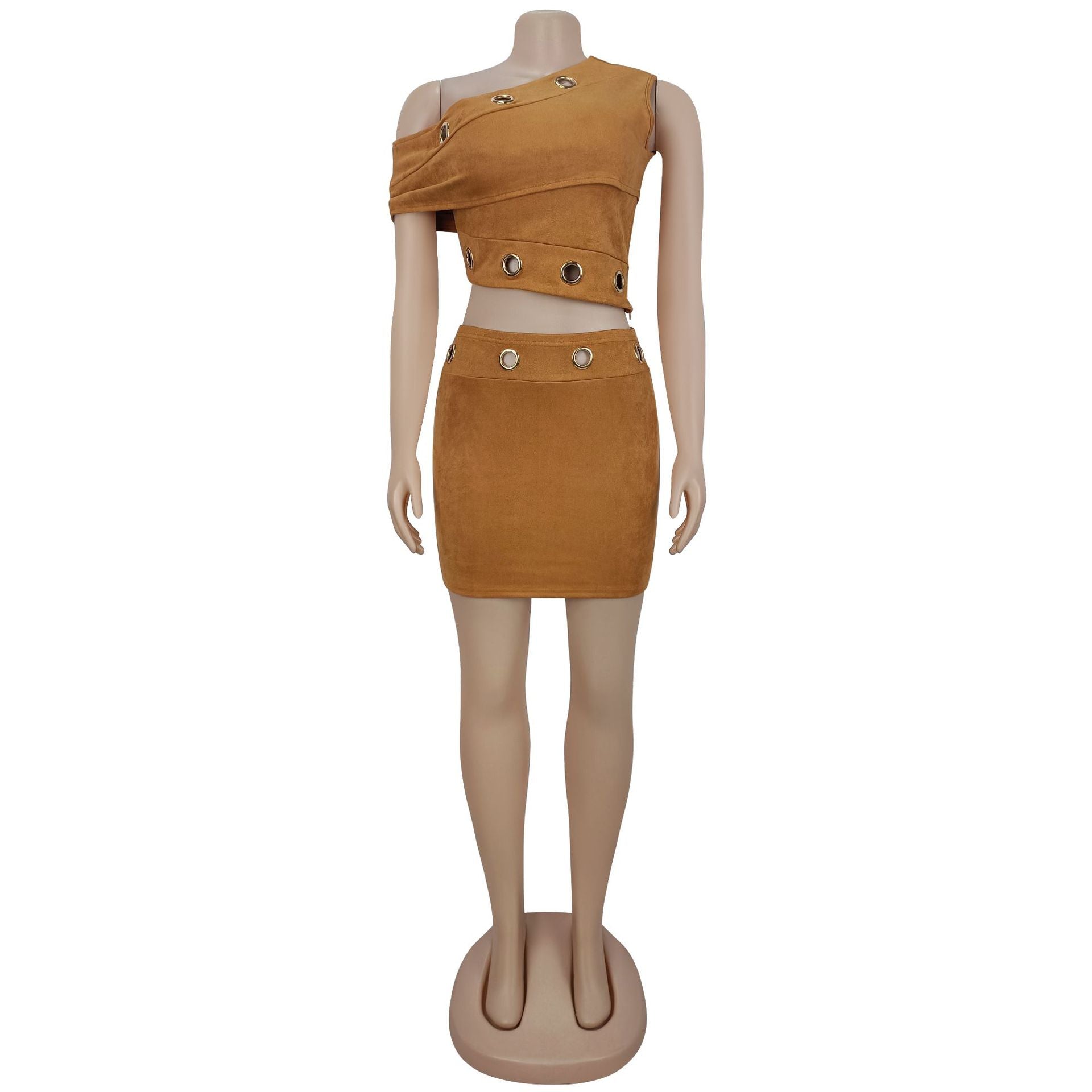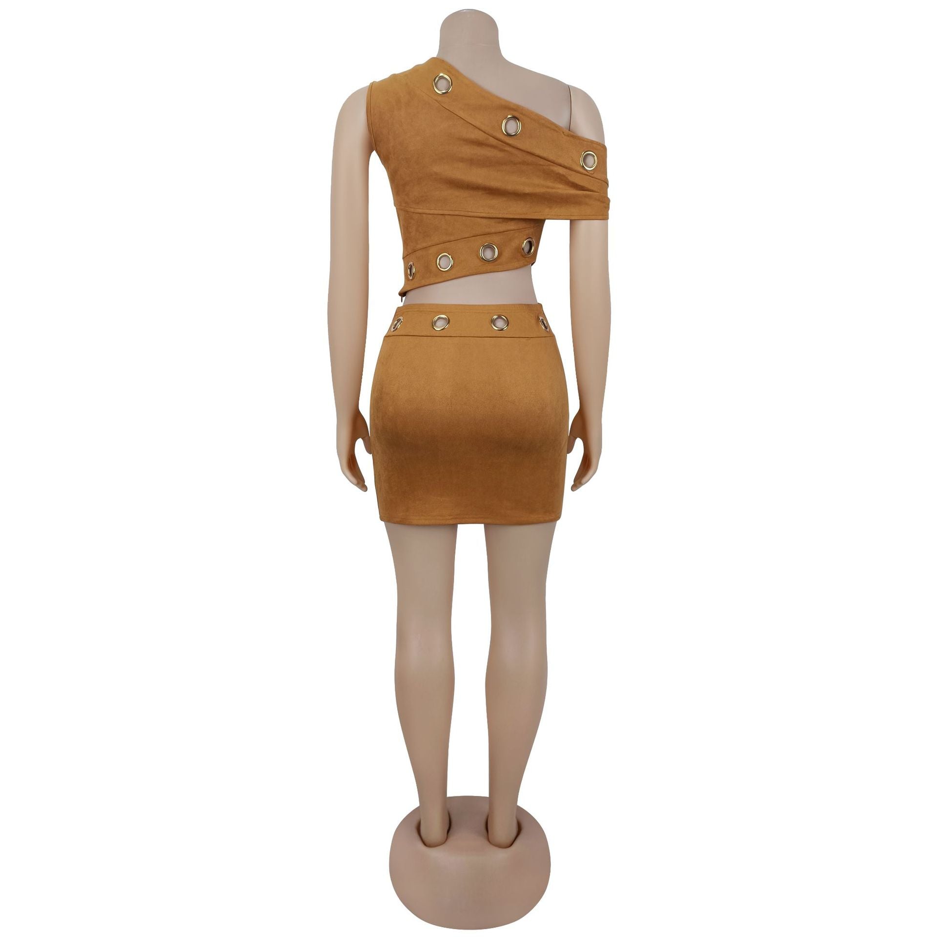 Make a daring entrance with this women's 2-piece set, a striking combination of edgy design and form-fitting style. The asymmetrical one shoulder crop top features a bold, slanted neckline that showcases the shoulder, paired with strategic cut out details framed by metal ring accents—adding an industrial-chic touch that elevates the rebellious night time aesthetic. The high waisted bodycon mini skirt hugs the curves from hip to hem, with a sleek silhouette that’s ideal for club wear, music event outfits, or bold party styling.