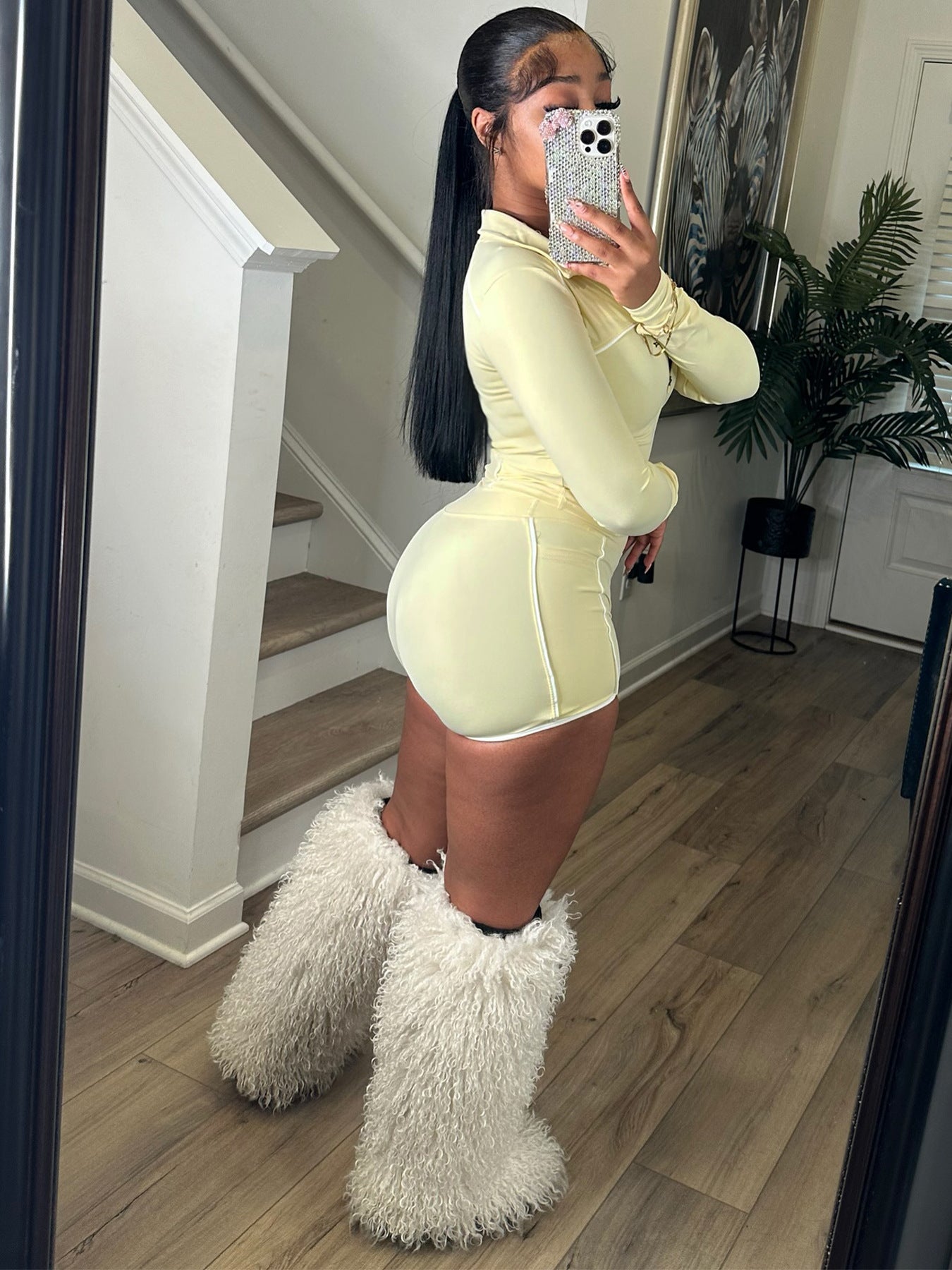 This women’s two-piece set features a cropped zip-up jacket with long sleeves and a matching form-fitting short bottom with subtle contrast stitching. It fits users searching for cropped top, women's long sleeve cropped jacket, form-fitting casual two-piece sets, or cropped two-piece outfits for daily hangouts and light social events.