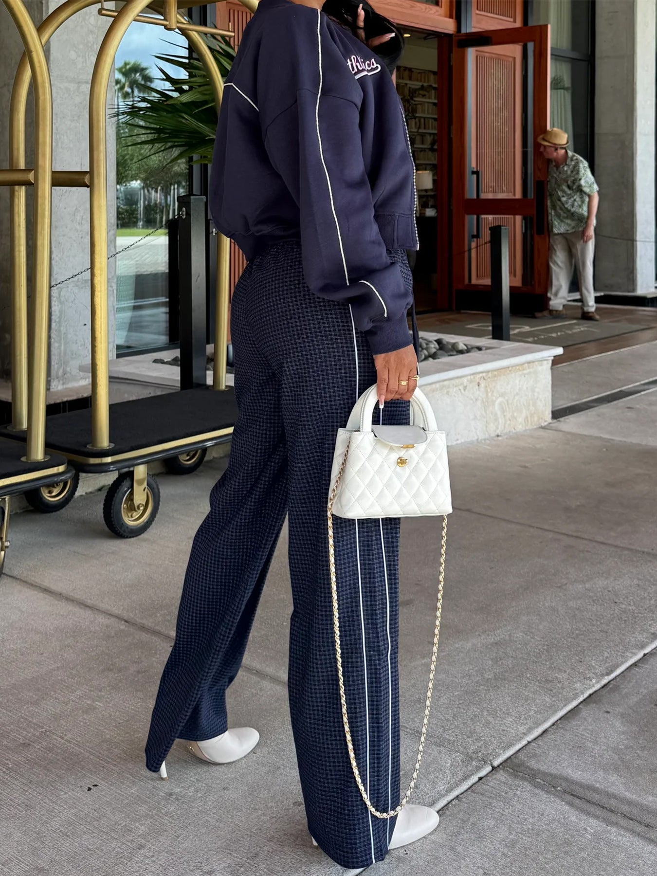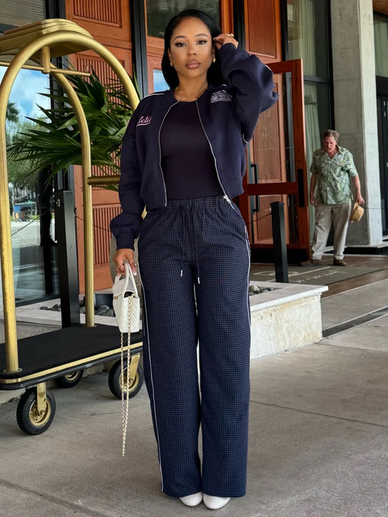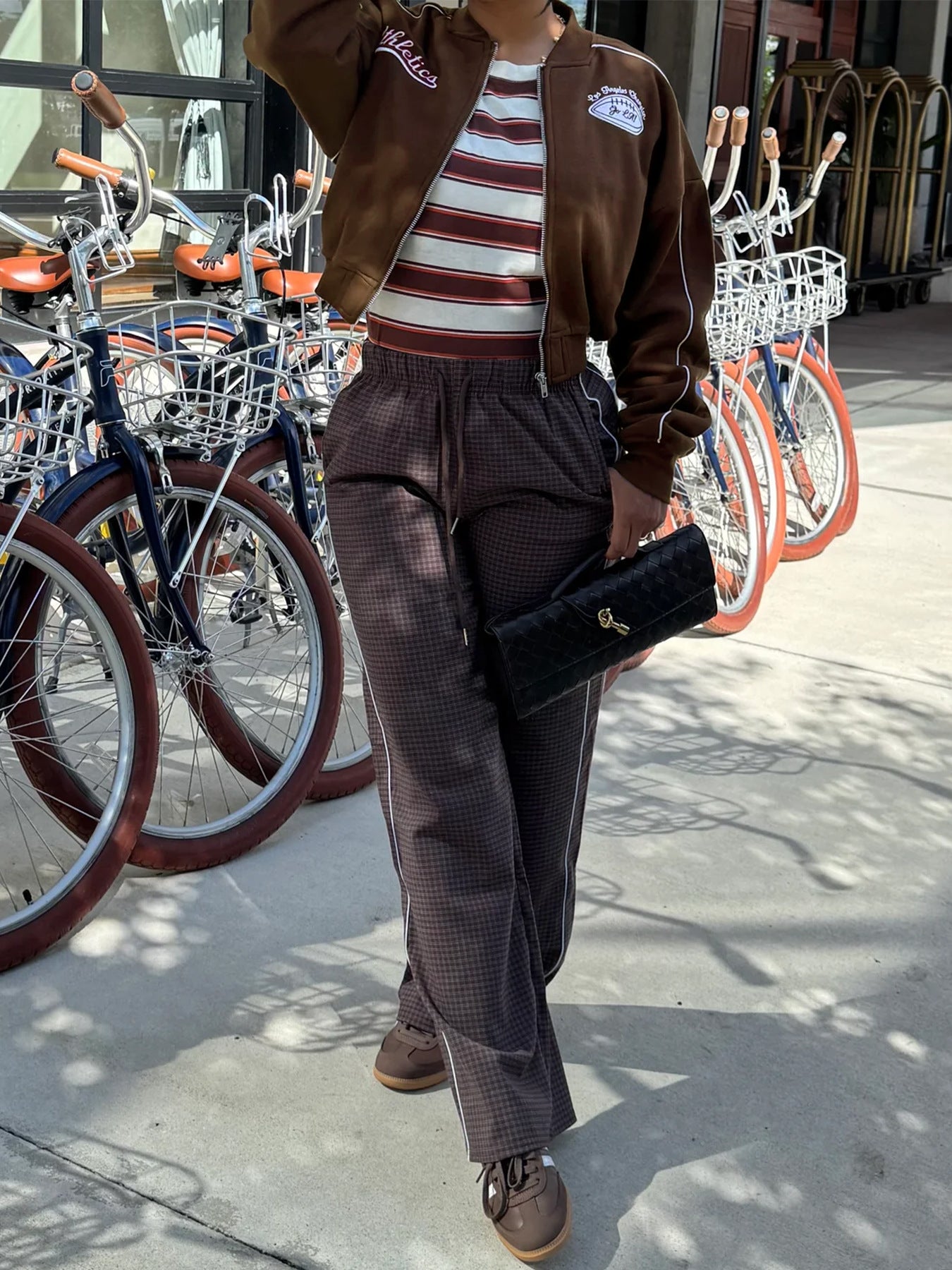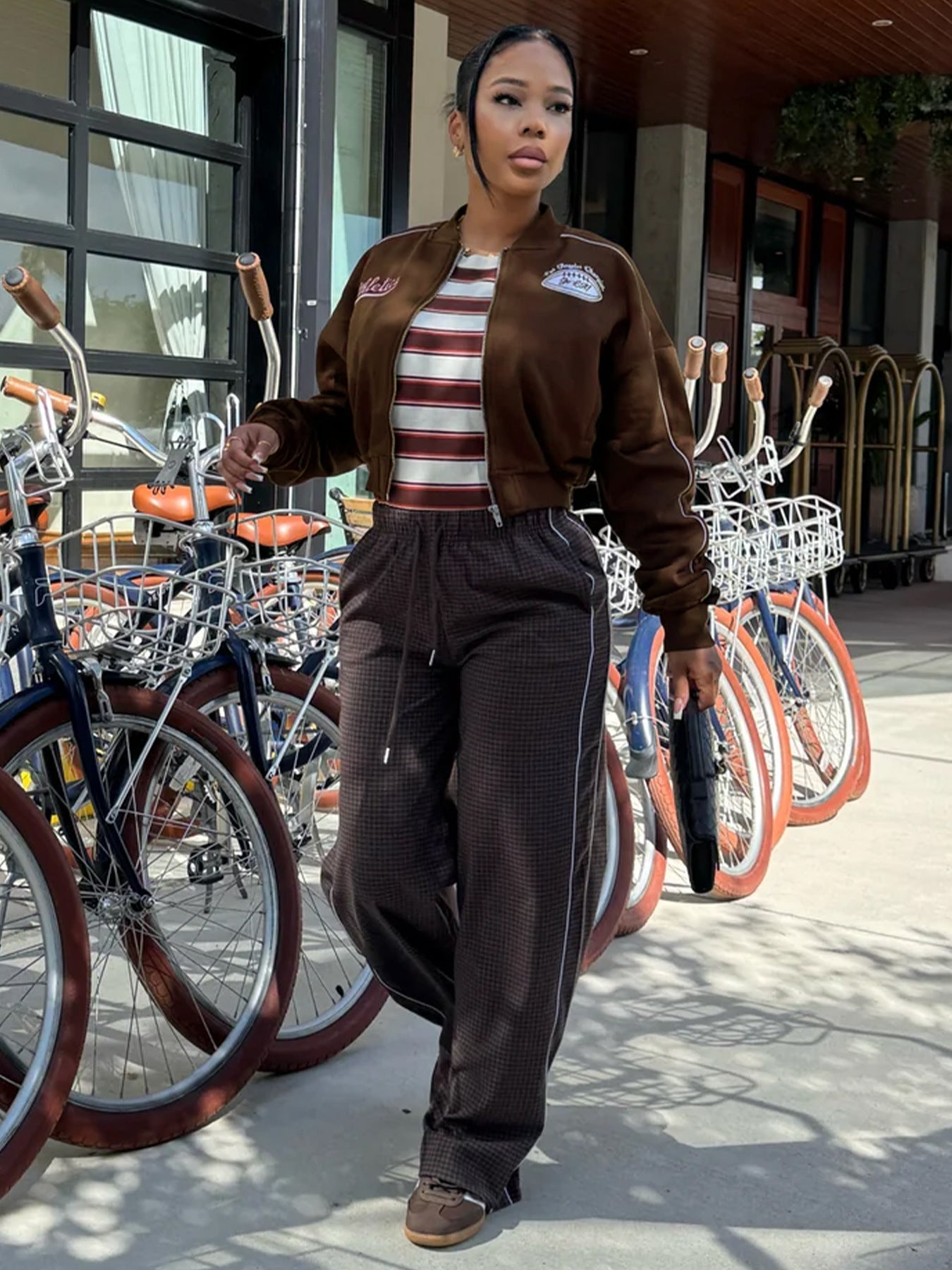 This women’s jacket features a cropped baseball jacket with full zipper closure, adorned with "Athletica" and "Los Angeles Champion" vintage-style embroidered patches.
