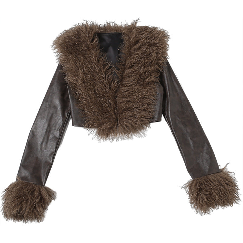This women’s jacket features a smooth cropped faux leather shell paired with plush curly faux fur trim on the wide collar and cuffs.