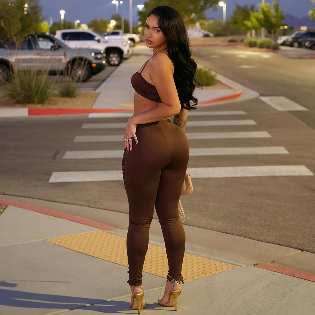 This women’s two-piece set features a smooth nude halter bandeau crop top (with an adjustable neck tie to tweak the fit for different body shapes) and form-fitting high-waist leggings with waist crisscross lace-up and leg side lace-up details—the delicate lace-up accents add edgy, subtle glamour without feeling overdone. The stretchy seamless fabric stays soft against skin while hugging the silhouette: pair the full set with clear strappy heels and a dainty gold body chain for head-turning style at rooftop bar date nights, layer an oversized linen blazer over the top and keep the leggings as a base for chic summer brunch outings, or match the set with chunky platform sandals for bold outdoor music festival daytime looks. This nude lace-up two-piece set for feminine edgy style balances comfort and statement details, making it a flexible pick for both playful casual plans and polished evening gatherings.