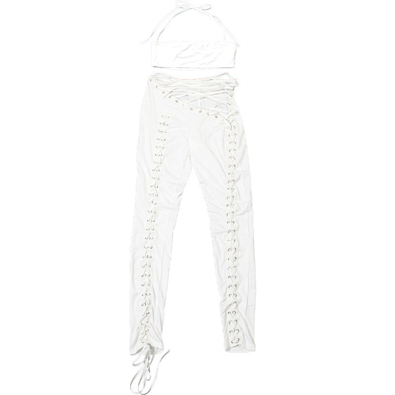 MB1807 Women's Nude Halter Bandeau Crop Top & Waist-Leg Lace-Up High-Waist Leggings Two-Piece Outfit
