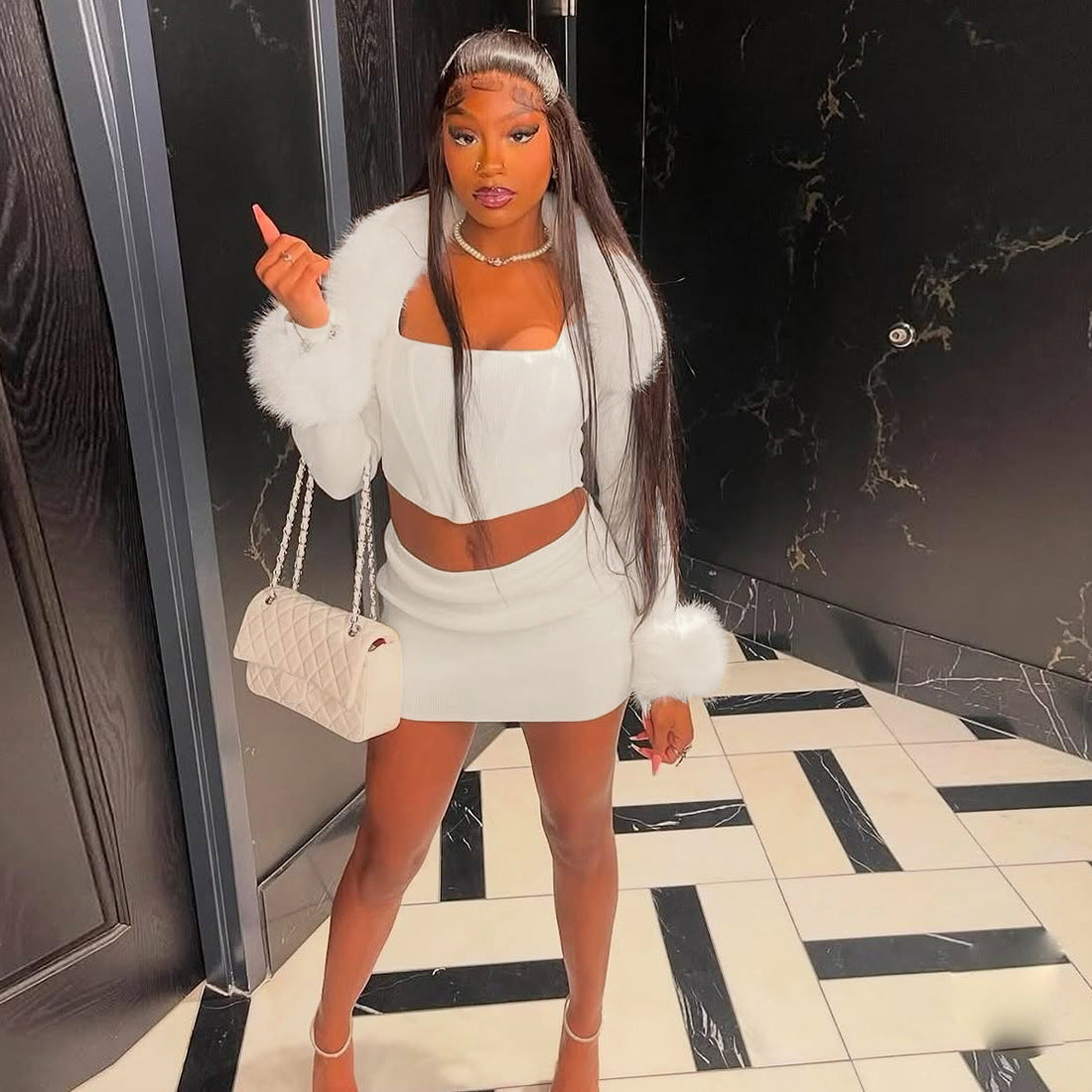 This versatile women's faux fur accent three-piece outfit is crafted from soft, stretchy polyester and spandex fabric, perfect for balancing comfort with a eye-catching look. The set includes a form-fitting square-neck crop top, a body-hugging mini skirt, and a long-sleeve shrug—ideal for adding a luxe touch to night out or party ensembles.This polyester spandex 3-piece dress set works for casual events, date nights, or festive occasions, making it a go-to addition for any fashion-forward wardrobe.