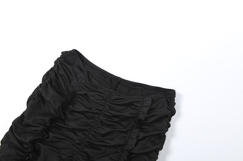 This two piece set combines sleek bodycon design with textured ruching, featuring a plunging halter neck crop top with all-over ruche detailing, high-waisted capri pants with matching ruching and tie accents at the cuffs.