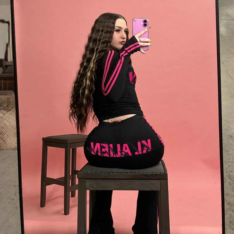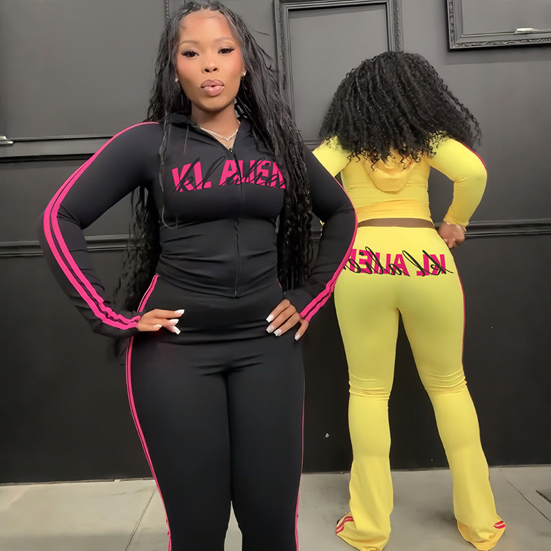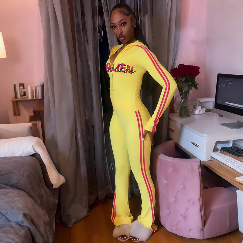 This hooded two piece set with flare pants blends Y2K streetwear vibes with casual comfort, featuring a slim-fit hooded zip-up top with bold letter print, high-waisted flare pants with pink side stripes. The zip-up top’s hood adds a sporty touch, and the flare pants elongate the legs for a flattering silhouette.