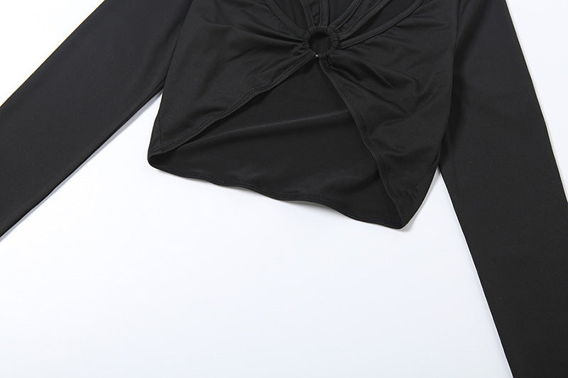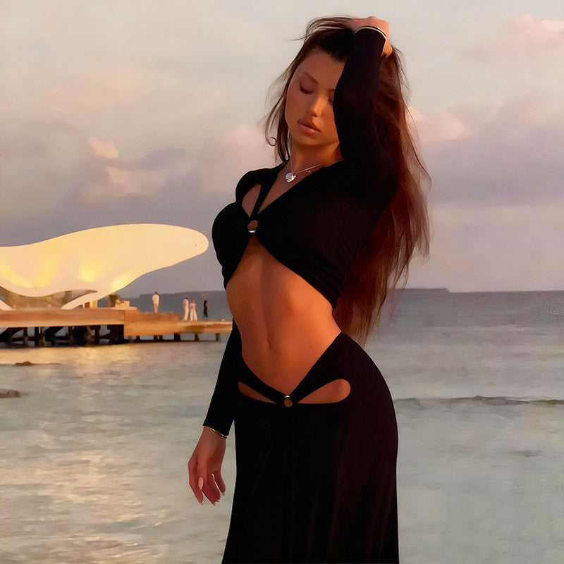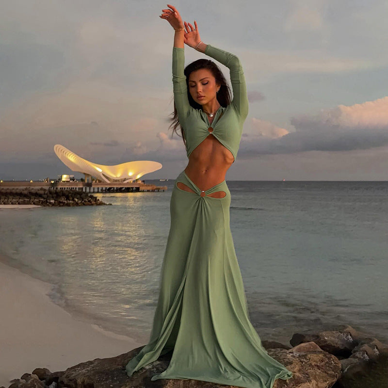 This striking Women's Cut Out Long Sleeve 2 Piece Set combines bold design and elegant silhouettes. The long sleeve crop top features a deep V - neck with front cut - out details. Paired with a floor length fitted maxi skirt that drapes gracefully to the ground, this set offers a sleek, elongated silhouette perfect for evening parties, wedding guests, or cocktail events.